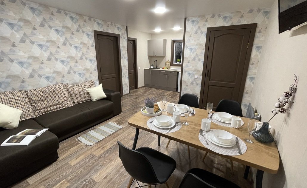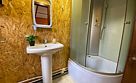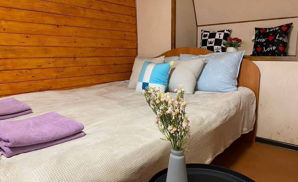 Коттедж 35м2. Спальная комната с двуспальной кроватью, кухня-гостиная с угловым диваном, телевизором и обеденной зоной. Оборудованная кухня: эл. плита, холодильник, чайник, микроволновка, набор посуды. Санузел с душевой. Зона барбекю.