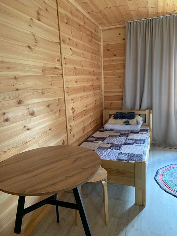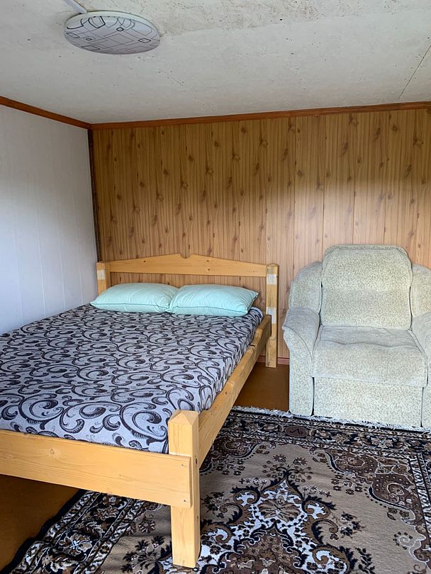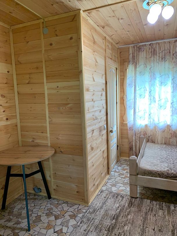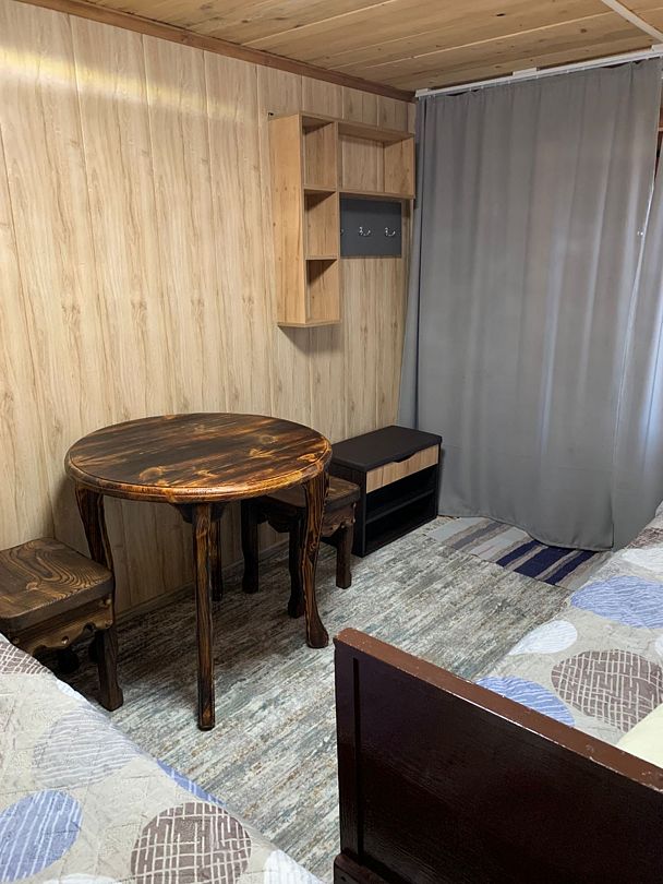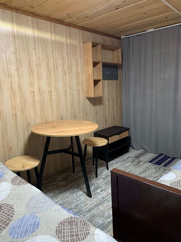 Уютный 3х местный номер на 2-м этаже двухэтажного коттеджа. В номере имеется: двухспальная кровать, односпальная кровать, чайник, санузел с раковиной. Так же имеется крытая терраса-балкон (смежная на 2 номера) в которой имеется холодильник, стол со стульями.