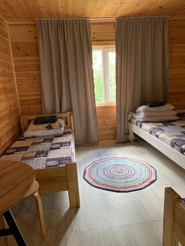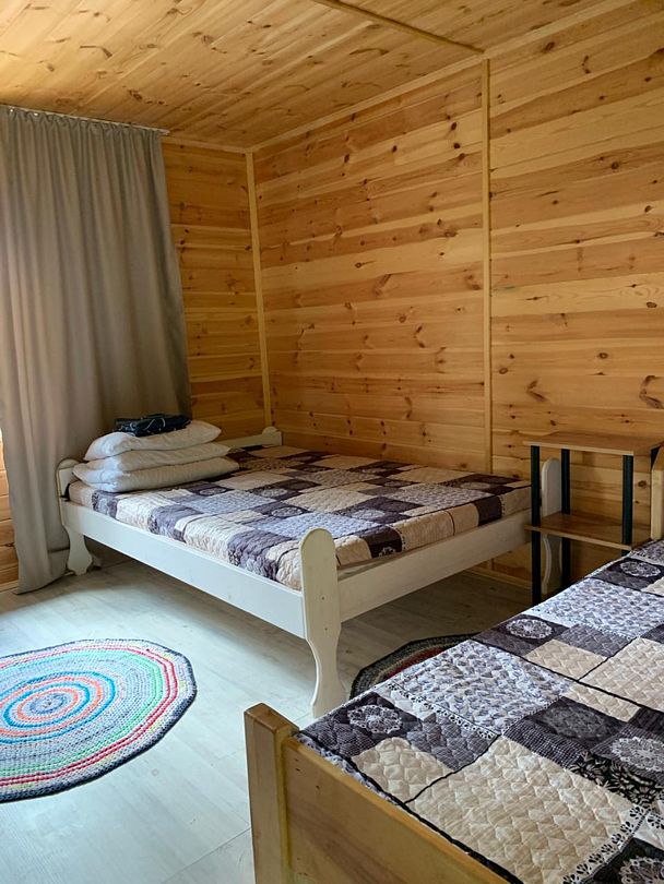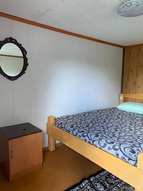 Уютный 4х местный номер на 2-м этаже двухэтажного коттеджа. В номере имеется: двухспальная кровать, 2 односпальные кровати, чайник. Так же имеется крытая терраса-балкон (смежная на 2 номера)