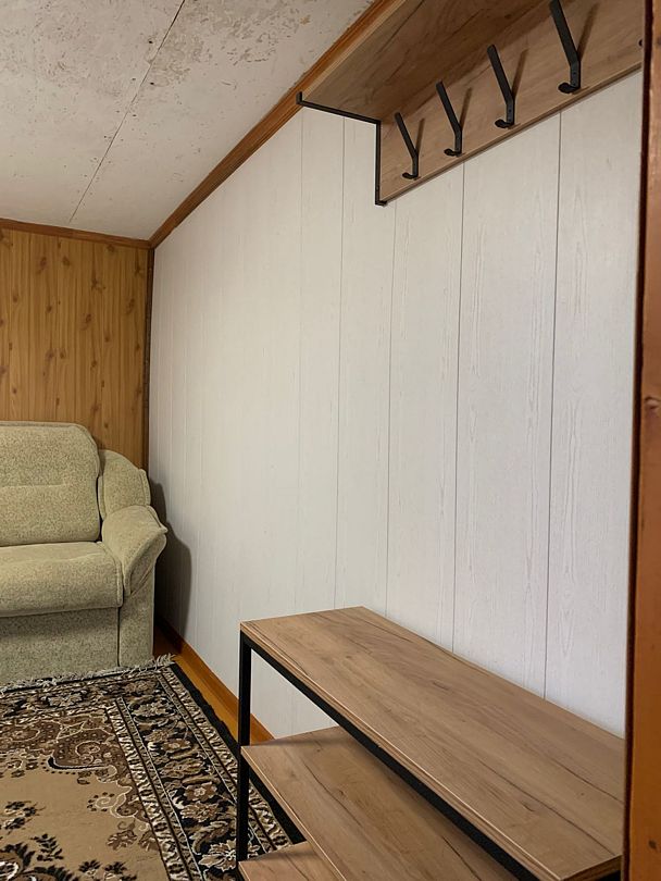 Интерьер выполнен в тёплых деревянных тонах, создающих атмосферу уюта и загородного отдыха.