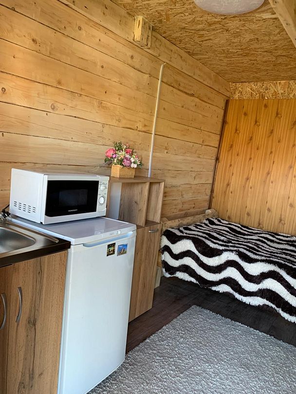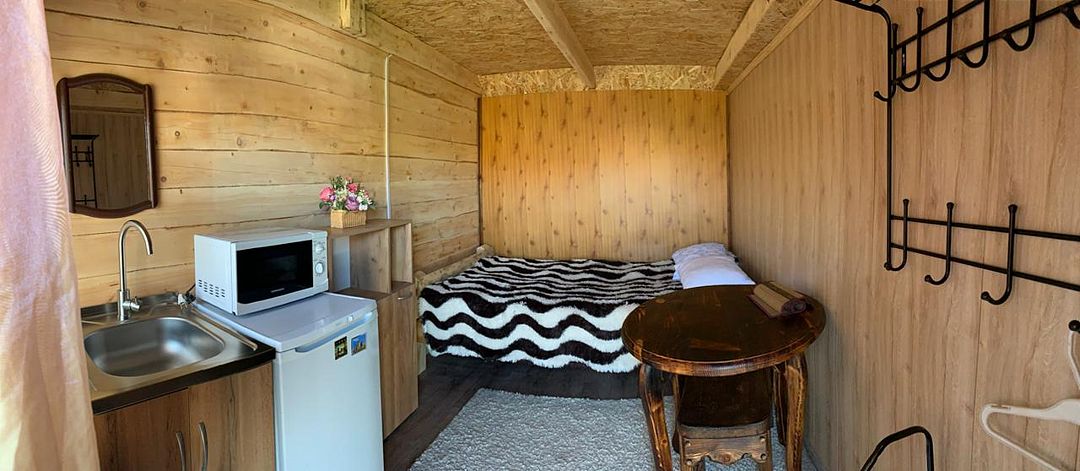 В номере предусмотрены базовые удобства: раковина, холодильник, микроволновка, шкафчик, а также стол и стулья для приёма пищи.