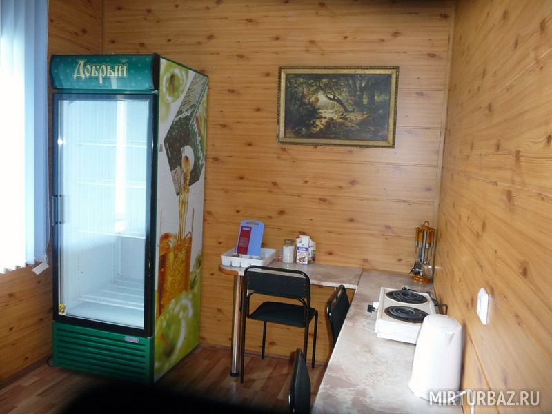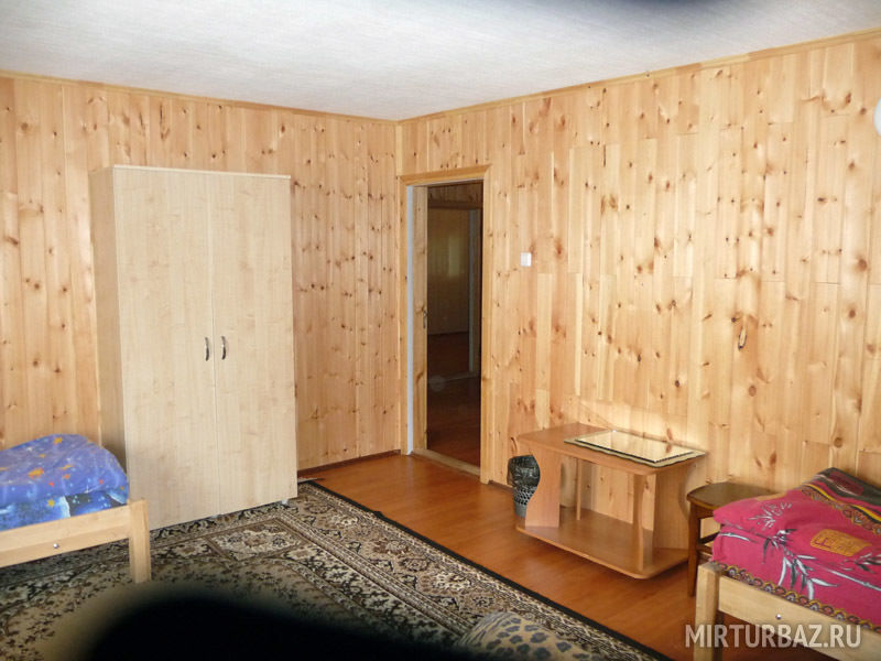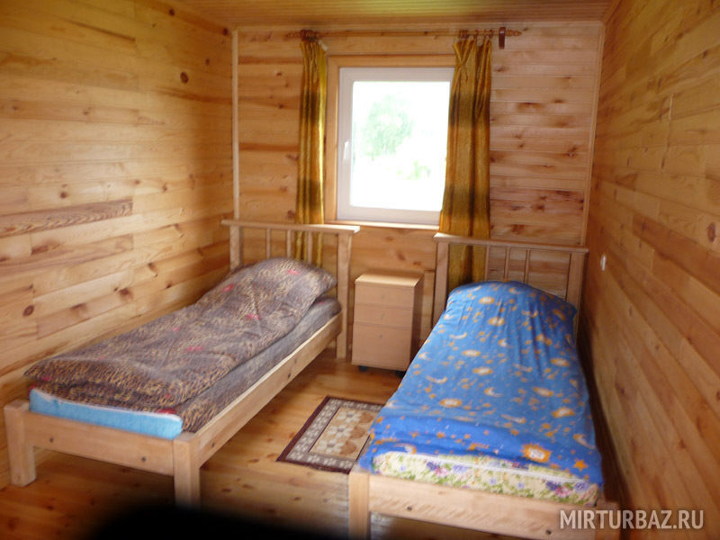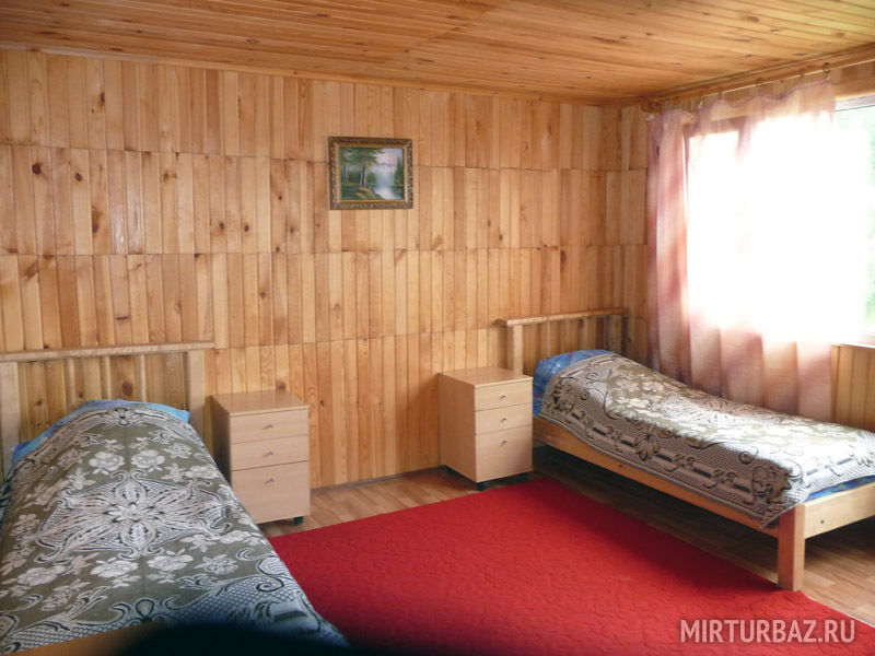 В номер входит: две односпальные кровати, вешалка для одежды, две прикроватные тумбочки, два табурета, журнальный столик. Санузел и душ с горячей водой находятся на территории базы. Кухня пристроена на первом этаже дома.