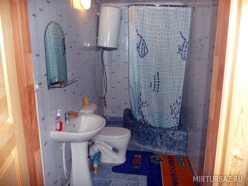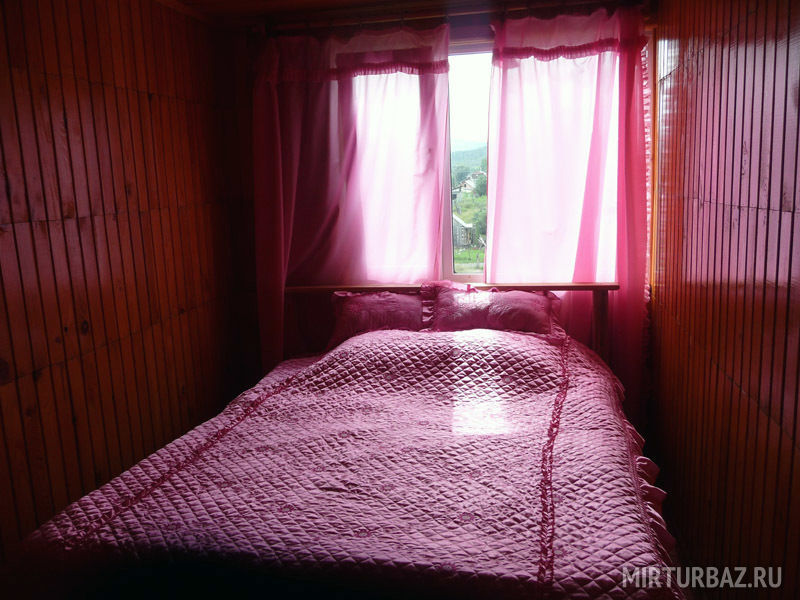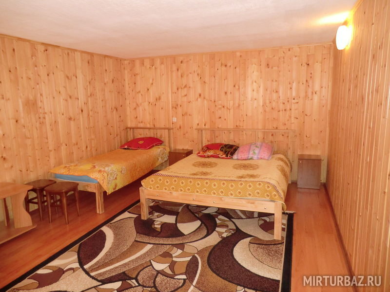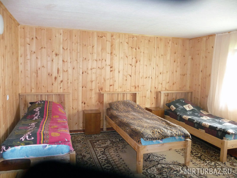 Трехместный номер: три односпальных кровати, три прикроватные тумбы, шифоньер, столик, зеркало, три табурета. Душевая с горячей водой, санузел, кухня на втором этаже.