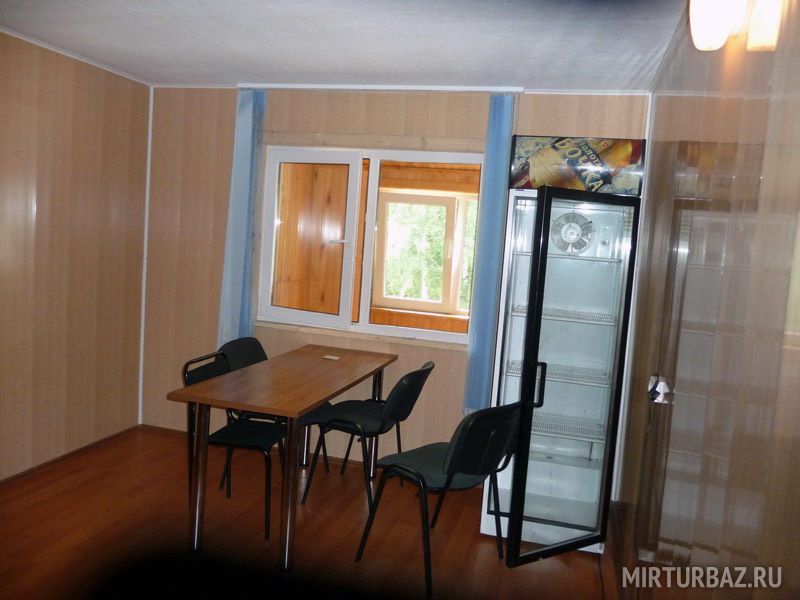 Четырехместный номер: две односпальные кровати, одна двухспальная, шифоньер, три прикроватные тумбы, зеркало, журнальный столик, три табурета. Душевая с горячей водой, санузел, кухня, холодильник на этаже.