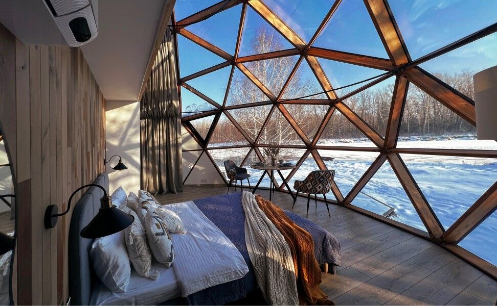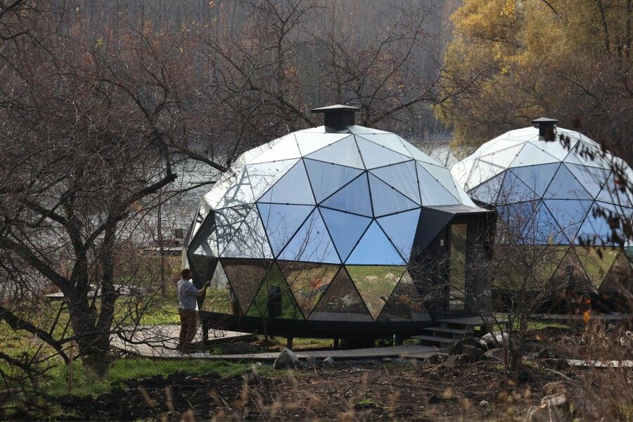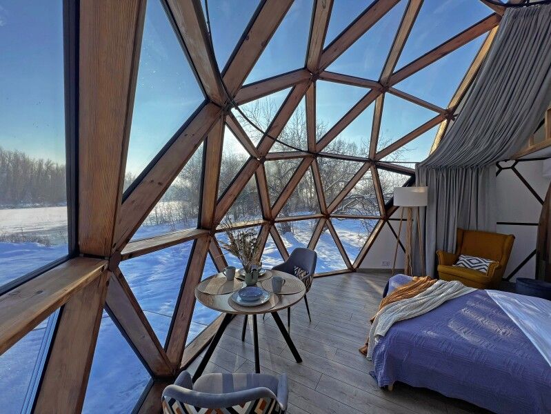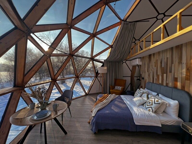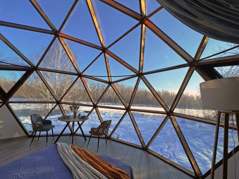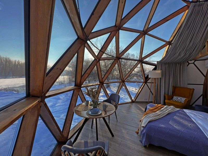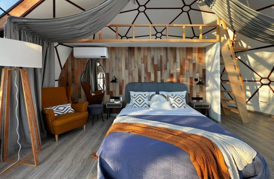 Сфера-это купольный дом с террасой, внутри сферы вас ждет удобная мини-кухня с обеденным столом и стульями, просторная двуспальная кровать обеспечит вам спокойный и комфортный сон, для детей на втором этаже имеется двуспальный матрас, создавая уютное место для их отдыха, а кондиционер поможет даже в самую знойную жару. Особенностью этого уникального домика является панорамное окно, через которое открывается потрясающий вид на горы и живописную реку Катунь.