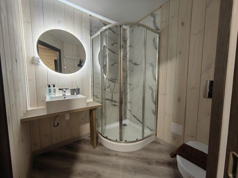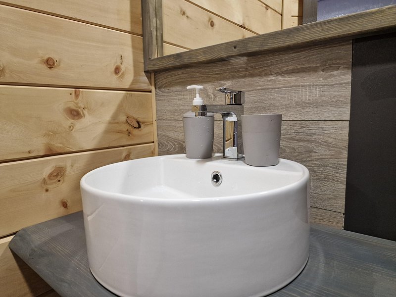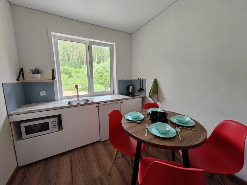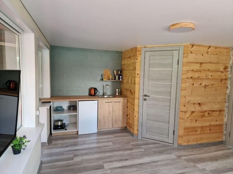 Уютный одноэтажный домик с приватной террасой и бесплатным персональным мангалом. На территории домиков, для удобства гостей, имеется летняя кухня для самостоятельного приготовления пищи.