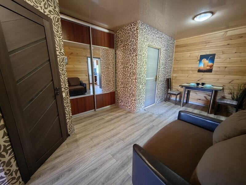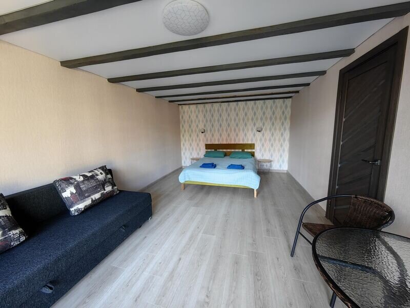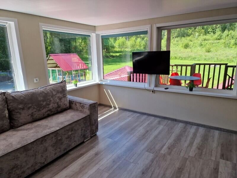 Двухкомнатный номер в коттедже расположен на первом этаже с балконом. Гости первого и второго этажей коттеджа могут воспользоваться летней кухней, примыкающей к коттеджу.