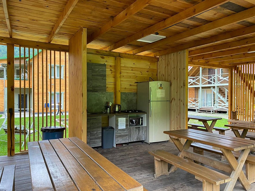 На базе есть общая летняя кухня, которой вы можете воспользоваться в любое время. Кухня оснащена всем необходимым для приготовления и хранения пищи.