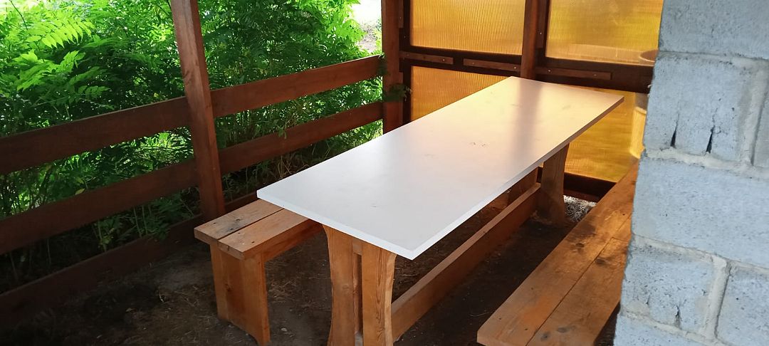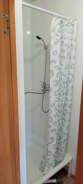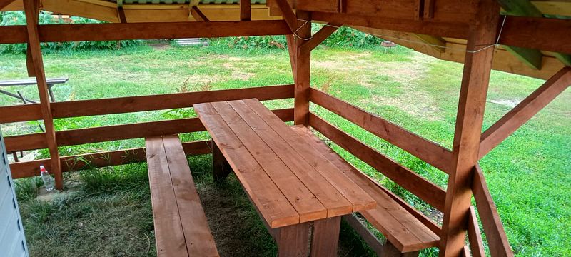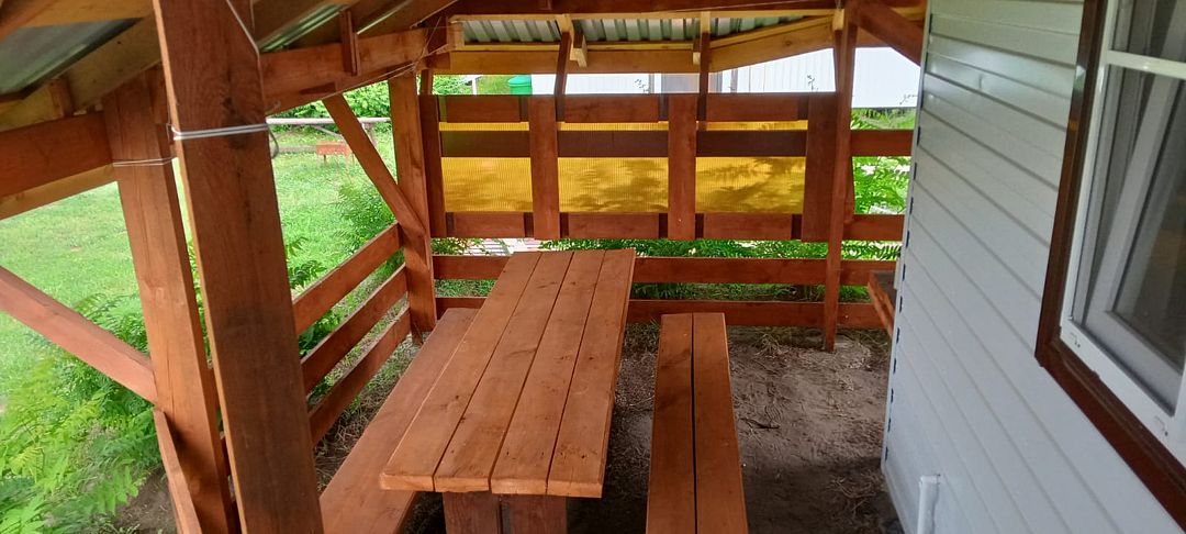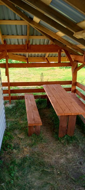 Спальное помещение с одной 2-х спальной, двумя односпальными кроватями и диван. Санузел с унитазом, раковиной, душем с хол. и гор. водой, уличный навес со столом и скамьями.