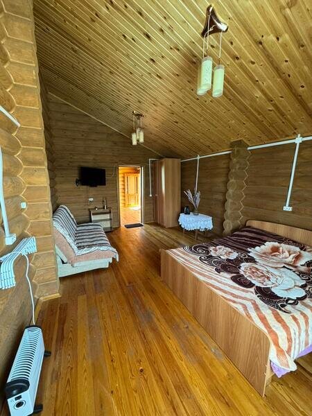 Номер оборудован: двуспальная кровать, раскладной диван, телевизор, холодильник, чайник, шкаф, столик, тумба, комплект постельного белья и полотенец, душ, туалет.