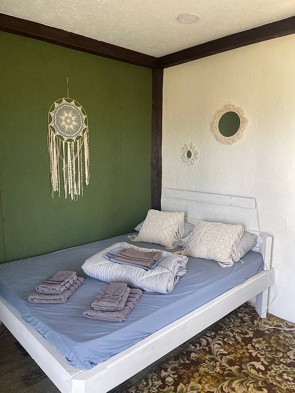 Горячий душ, туалеты, летняя кухня, посуда, мангальная зона, баня, бассейн - находятся на территории общего пользования.