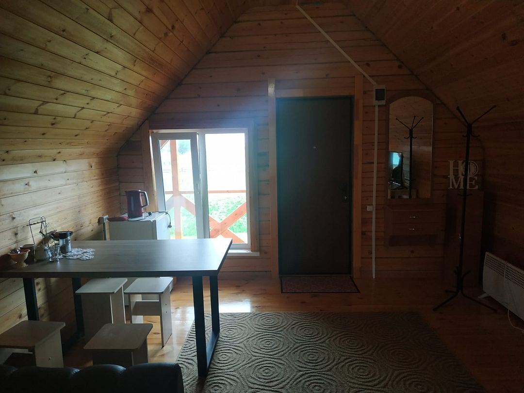 Второй этаж — это настоящий уголок спокойствия и отдыха, где расположены спальные места и небольшой обеденный уголок с холодильником и чайником. Особое очарование этому пространству придает панорамный вид на озеро, открывающийся из окон, где закаты над водой становятся незабываемыми мгновениями, оставляющими след в памяти.