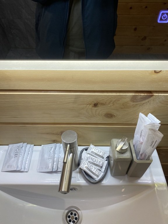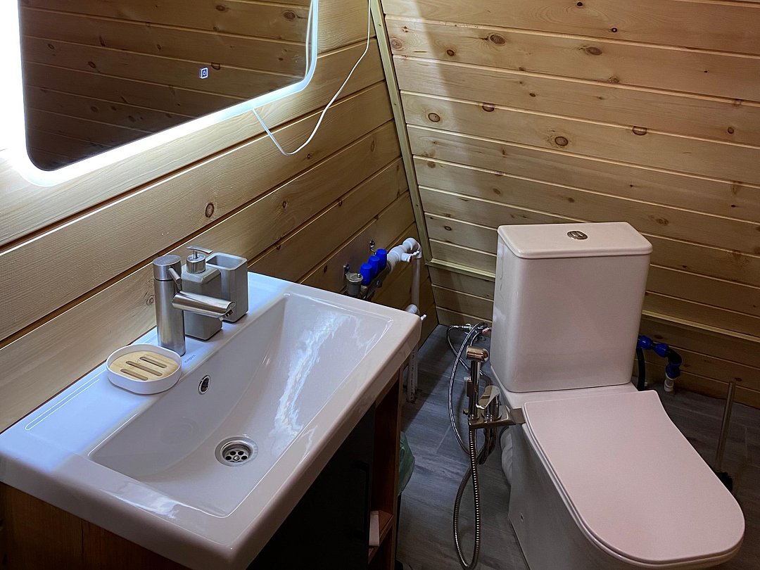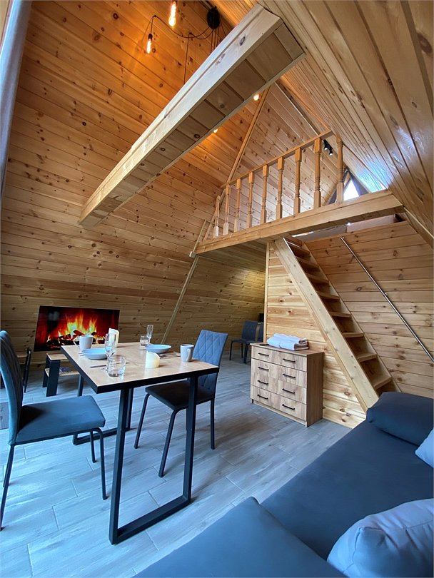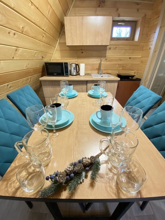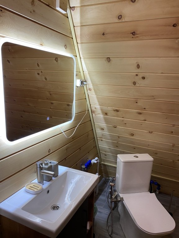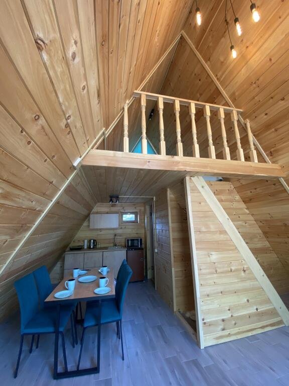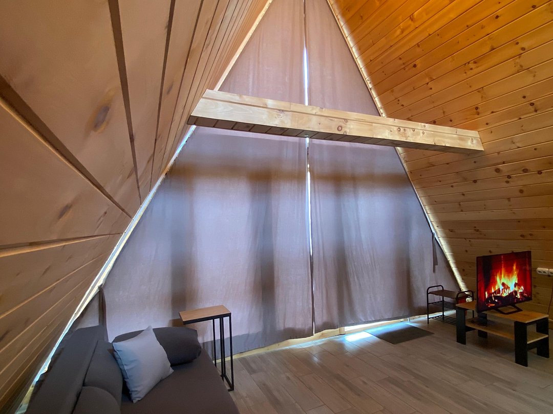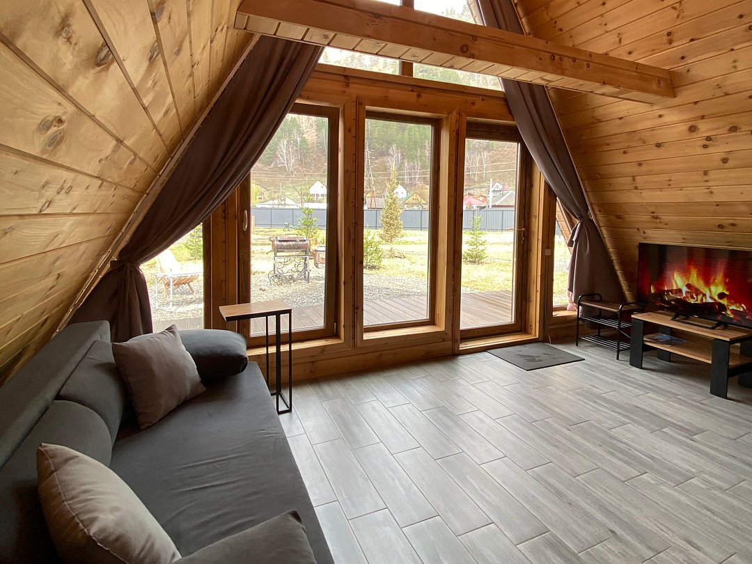 На территории базы находятся два уютных дома в стиле А-фрейм с отделкой экологически чистыми материалами, оборудованных всем необходимым для комфортного проживания. Домики с панорамными окнами включают кухню, оснащенную бытовой техникой, телевизор с голосовым помощником, современный санузел.