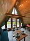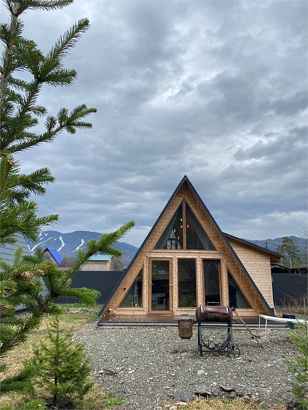 Благоустроенный дом в стиле А-Фрейм с панорамным видом на горы и запахом кедра для уютного проживания.