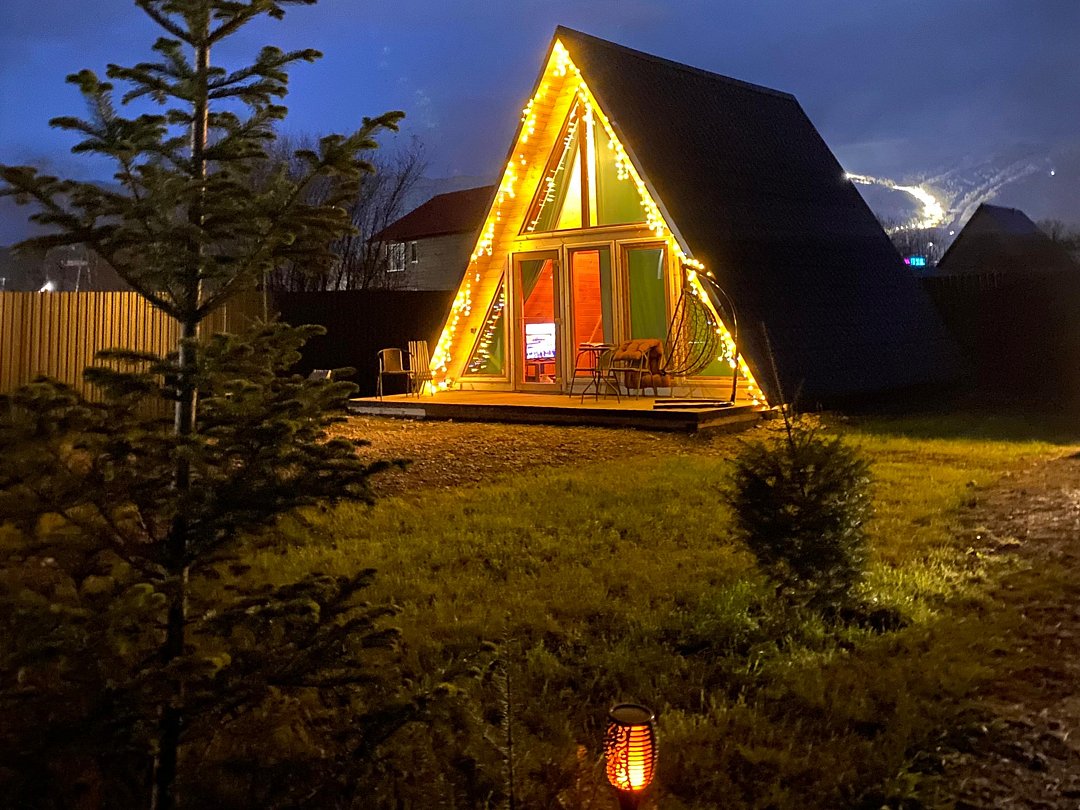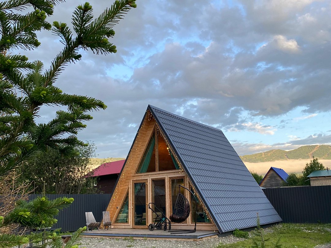 Благоустроенный дом в стиле А-Фрейм с красивым видом на горы и запахом кедра для уютного проживания.