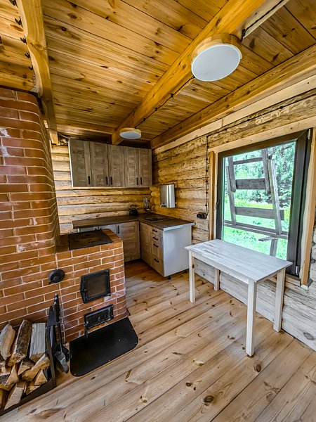 Сделан в традициях русской избы. Дом сделан из деревянного бруса, внутри стены выкрашены белой известью. Главное место в домике занимает печь с лежанкой, на которой приятно погреться в холодную погоду. Домик подойдет для тех, ко хочет погрузиться в атмосферу деревенского быта.