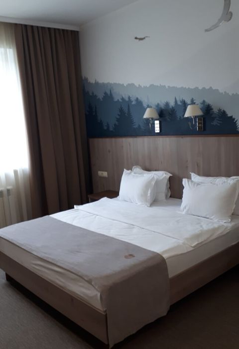 4. Номер: номер просторный, в номере есть все что необходимо для жизни кровати/ подушки удобные . Белье белоснежное. Полотенец с избытком, халаты, тапочки, одноразовые гели/ шампуни/ мыло - все есть, если что- то заканчивается всегда подложат новое. Единственное что удивило это уборка номеров после обеда. Раньше бывала в санаториях всегда уборка с утра, пока по процедурам бегаешь в номере уборка, а тут после обеда… приходишь хочешь отдохнуть после обеда полежать , возможно вздремнуть, а за дверью начинается стук в другие двери, хлопанья дверьми и ты уже не отдыхаешь, а ждешь когда тебя выгонят из номера чтобы убраться… ну как - то показалось странным, в целом к уборке претензий нет, ежедневно и все чисто👍🏻 Вода в душе с хорошим напором только пока все на процедурах, в остальное время бежит еле-еле, помыть волосы с таким напором весьма проблематично. Минус номера, кондиционер выставлен на отметку 17 градусов и изменить это нельзя, либо замерзай, потому как дует он не слабо, либо сиди в духоте, а третий вариант открой окно и покорми мошек, жучков и запусти в комнату большого мотылька.
