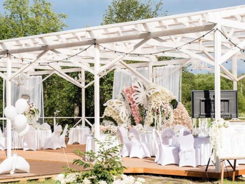 Отличная площадка вместимостью до 60 человек не только для проведения свадеб, но и для празднования юбилеев, выпускных, корпоративов и других торжеств. Для беседки у нас имеется несколько вариантов мебели: 7 круглых столов, 8 прямоугольных, 2 квадратных, 1 барный столик и 1 стол-президиум. В беседке проведены электричество и свет.