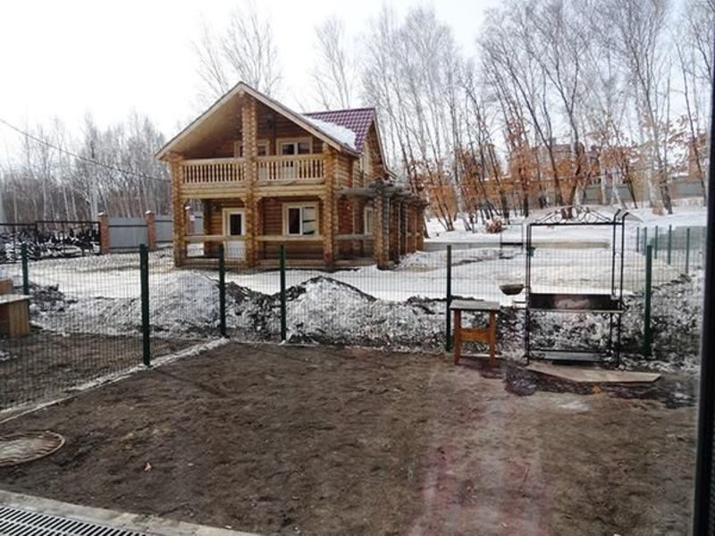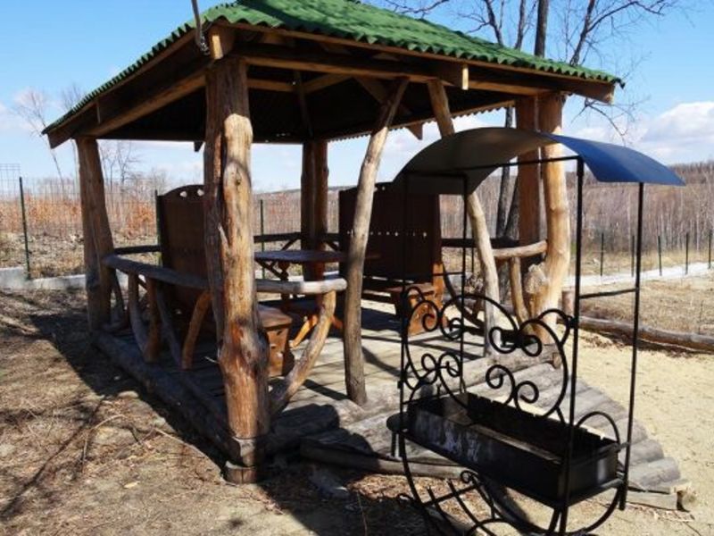 Внутри универсальный гриль для приготовления мяса, птицы и рыбы, скамейки и столик. В домике проведены электричество и свет.