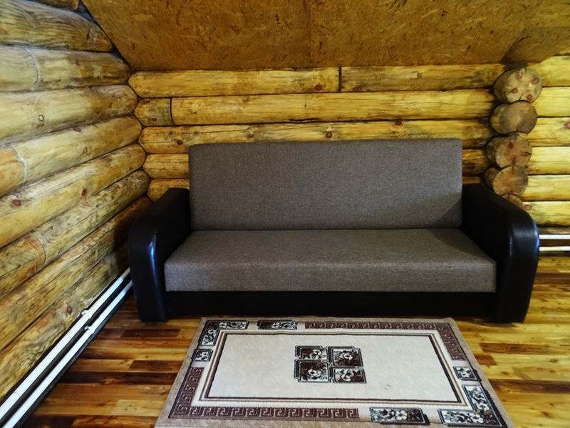 Коттедж на 8 спальных мест: 2 двуспальные кровати, 2 раскладушки и диван.