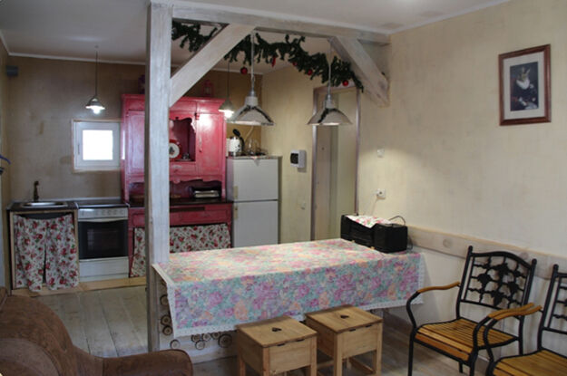 Две комнаты в стиле шале. В гостиной-столовой имеется кухонная зона со встроенной кухонной мебелью и бытовой техникой.