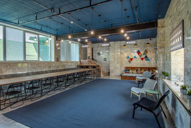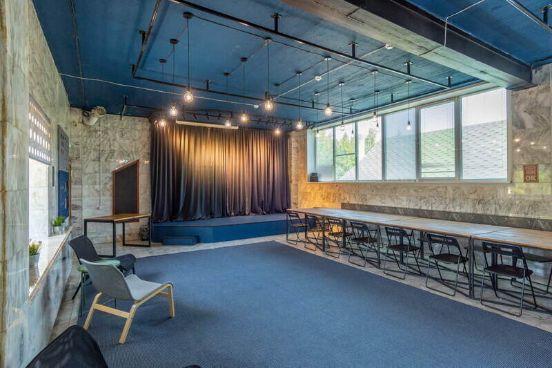 Вместимость 30 человек. Есть проектор, экран, флипчарт, телевизор, два микрофона, аудиосистема.