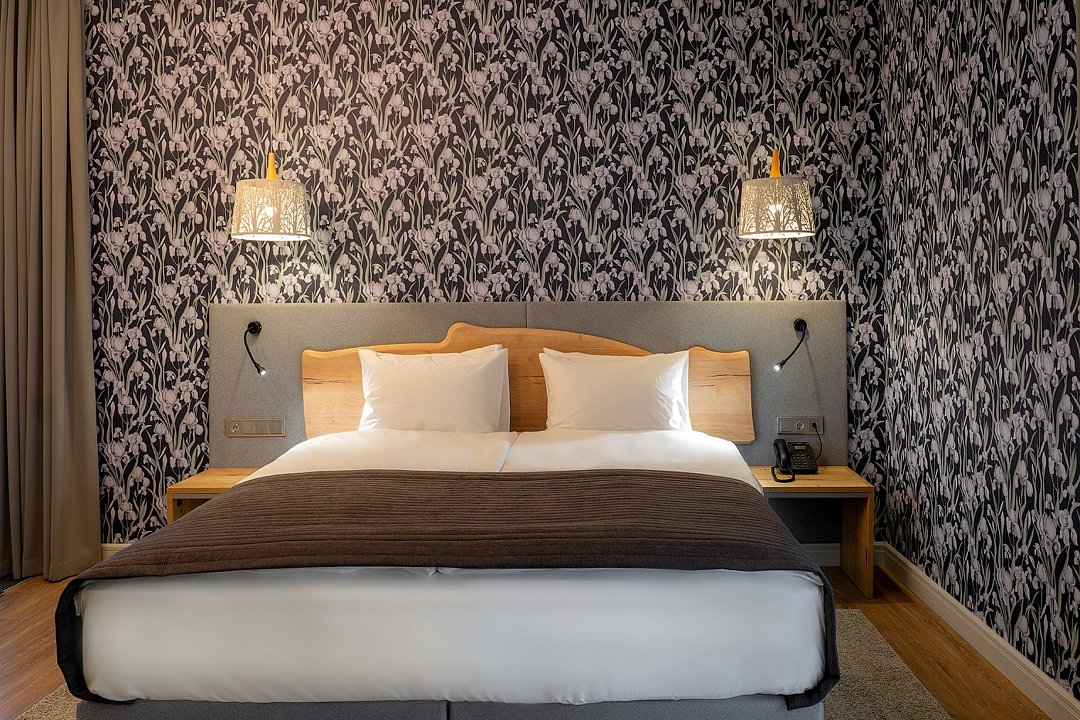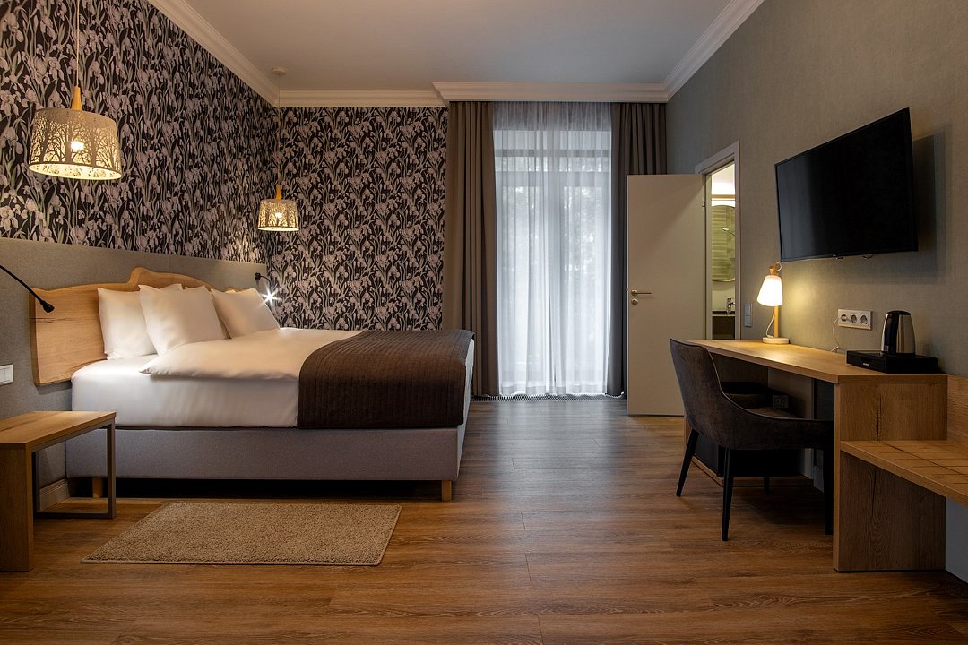 Двухместный номер с одной большой двуспальной кроватью размером king-size или двумя раздельными кроватями Площадь: 23м2 Вместимость: 2 человека Номер оборудован кондиционером, мебелью, имеется Wi-Fi, сейф для хранения вещей. Качественные европейские матрасы обеспечат крепкий сон и заряд сил. В ванной комнате имеются все гигиенические принадлежности. Вид из окна: панорамное окно с видом на сад и во двор.Услуги и удобства