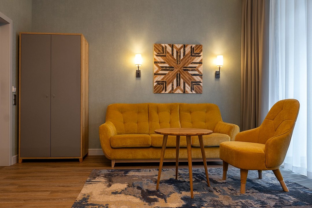 телевизор, Wi-Fi, телефон, кондиционер, система климат-контроля, светильник, настольные лампы, фен, электронные замки, кофемашина, душевая кабина, теплый пол, банные полотенца, тапочки, косметические средства, двуспальная кровать, две односпальные кровати, диван, шкаф для одежды, вешалки, журнальный столик, багажная тумба, зеркало, ковер, мини-бар, чайный набор, информационная карта, меню, сейф, чайник, унитаз, раковина, мягкая мебель, питьевая вода, отопление, душ, вид на сад, кресло, ламинат, высокие потолки, стаканы, стул, тумба, туалетные средства, туалет, цифровое тв, внутренний телефон, телевизор с плоским экраном, мини-холодильник, номер для некурящих, рабочий стол, без питомцевВ гостиничном номере
