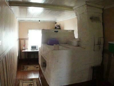 Кухня для самостоятельного приготовления пищи, кровать, большая русская печь, телевизор