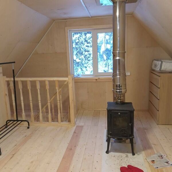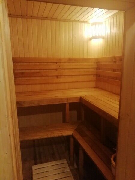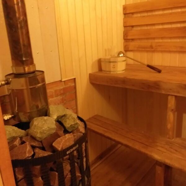 На первом этаже парилка, моечная и комната отдыха. В комнате отдыха плазменный ТВ, диван, стол, стулья, чайные принадлежности. На втором этаже комната отдыха: комод, односпальная кровать, двуспальная кровать.