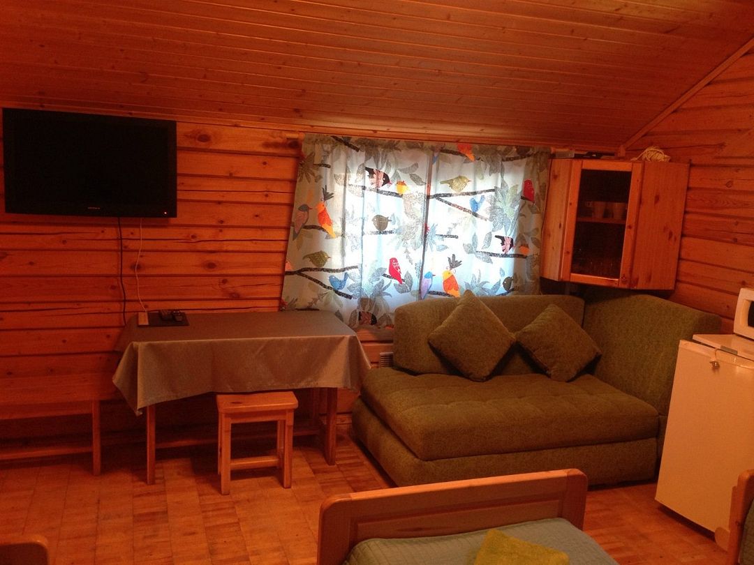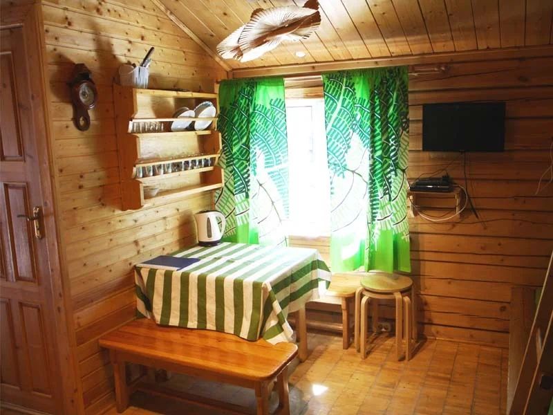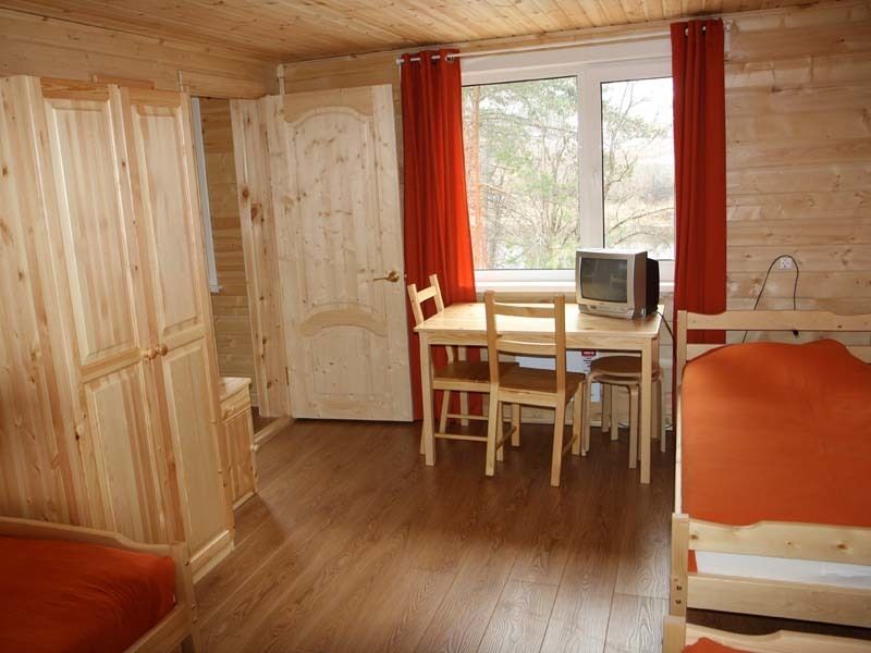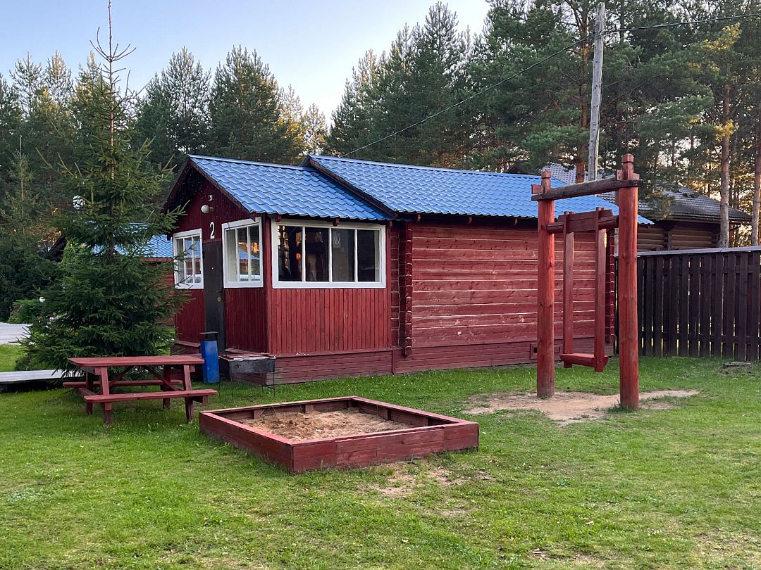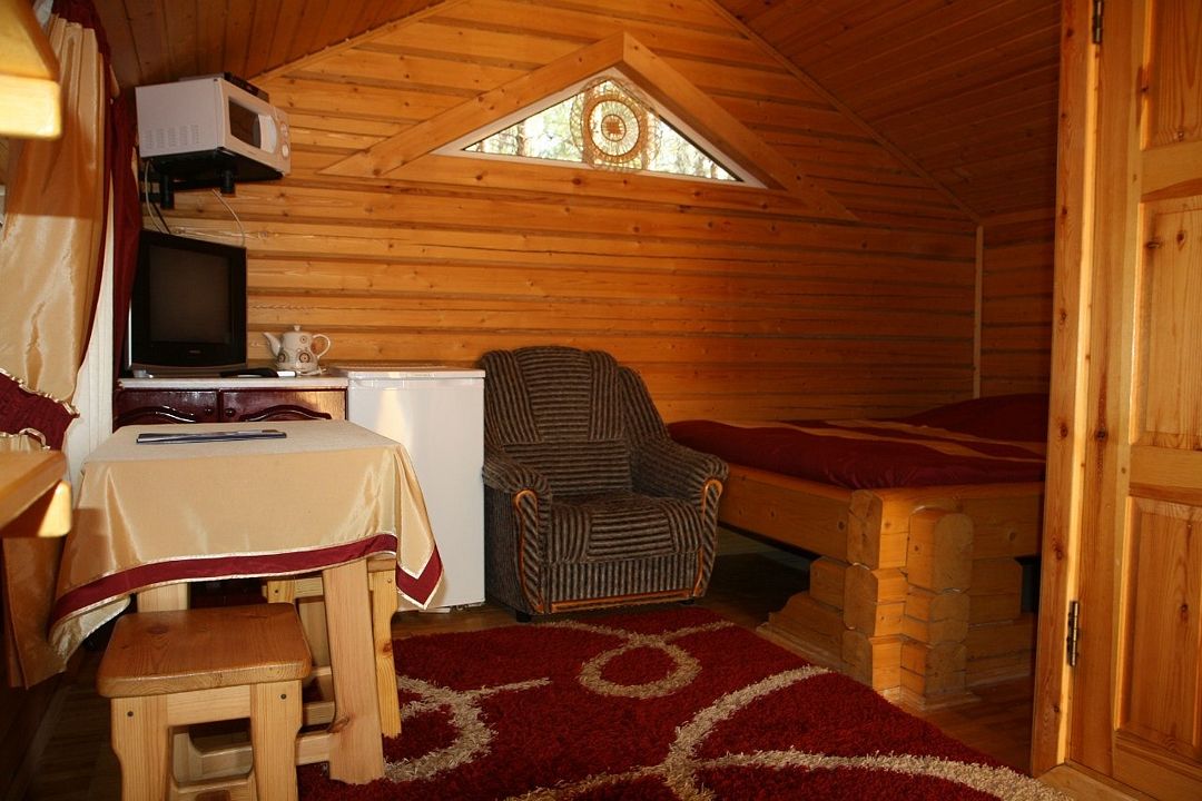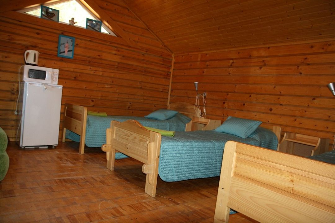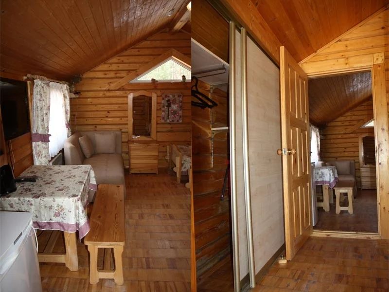 Одноэтажный коттедж на четыре человека. Состоит из одной комнаты для проживания, туалета/душевой, холодной веранды для хранения спортивного инвентаря. Кровати двухъярусные, врубленные в стену. Мини-кухня с чайником, микроволновой печью и холодильником.