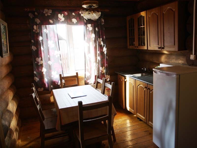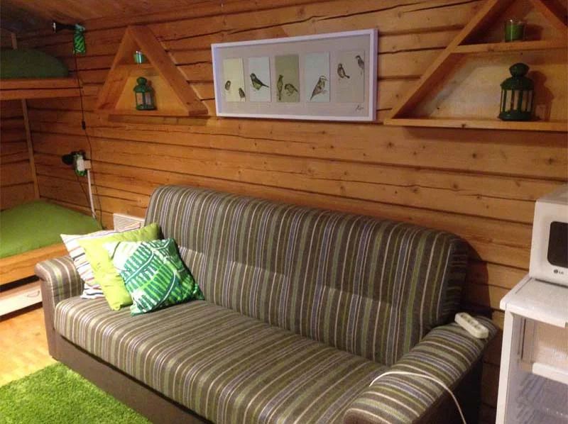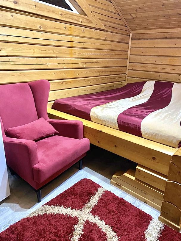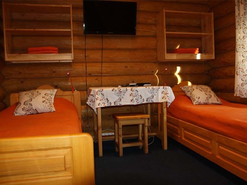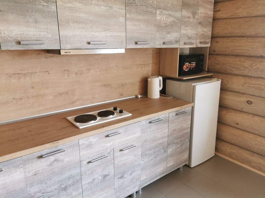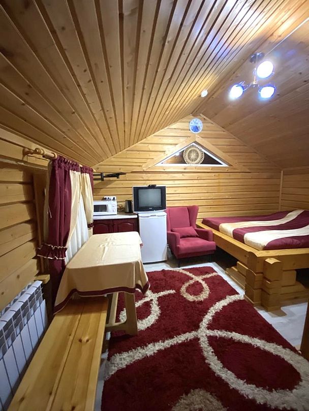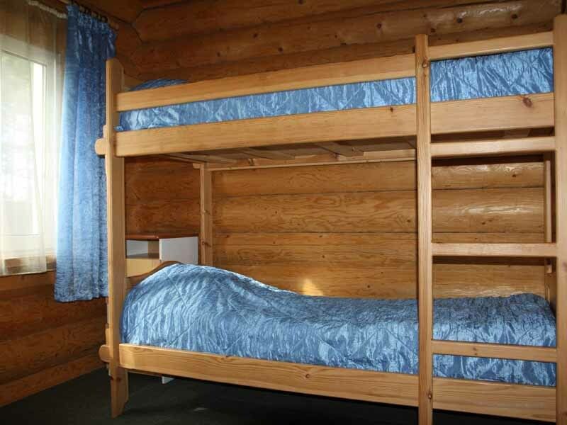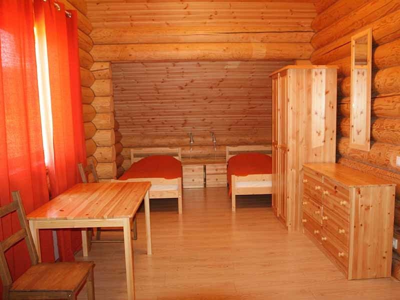 Одноэтажный коттедж на четыре человека. Состоит из одной комнаты для проживания, туалета/душевой, холодной веранды для хранения спортивного инвентаря. Кровати двухъярусные, врубленные в стену. Мини-кухня с чайником, микроволновой печью и холодильником.