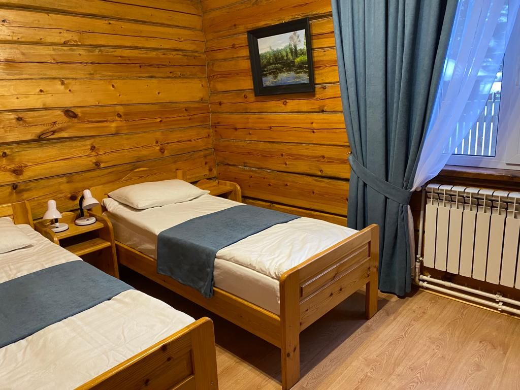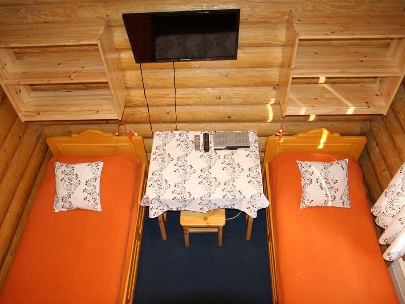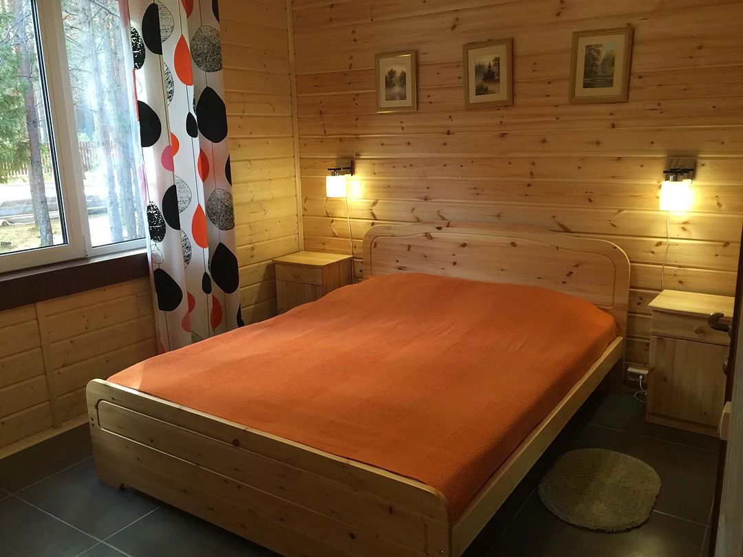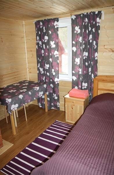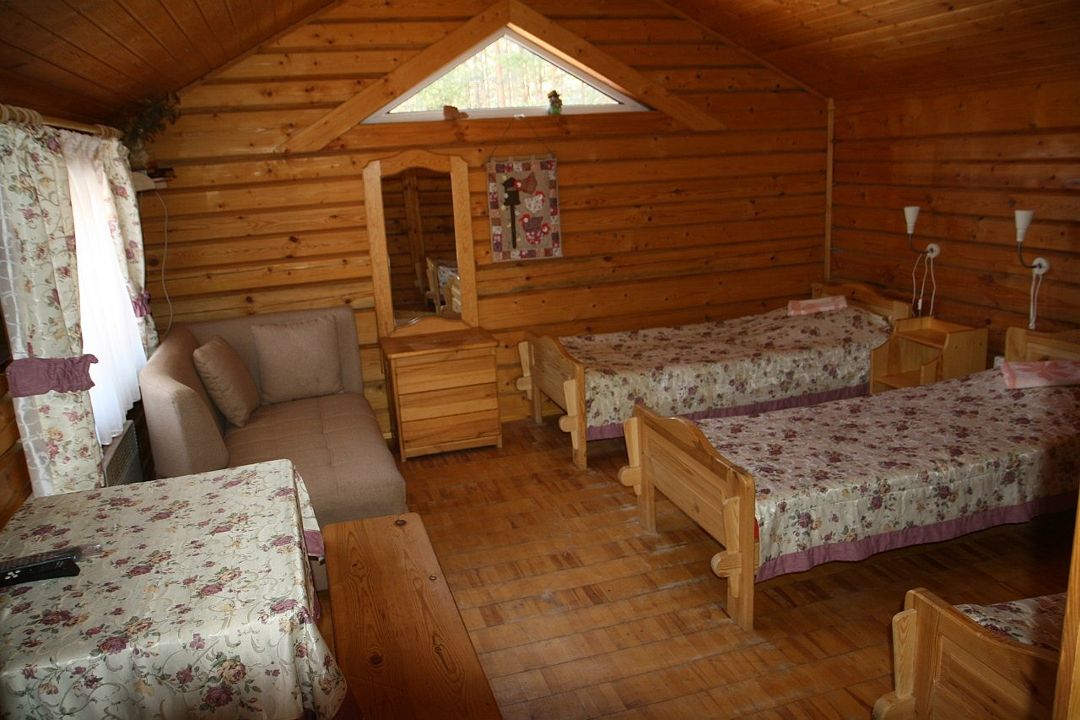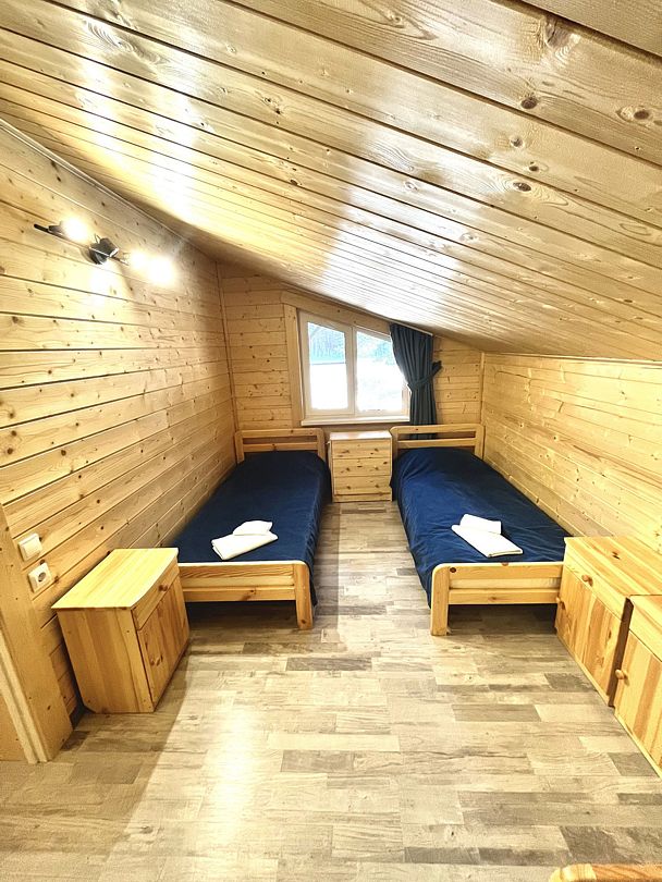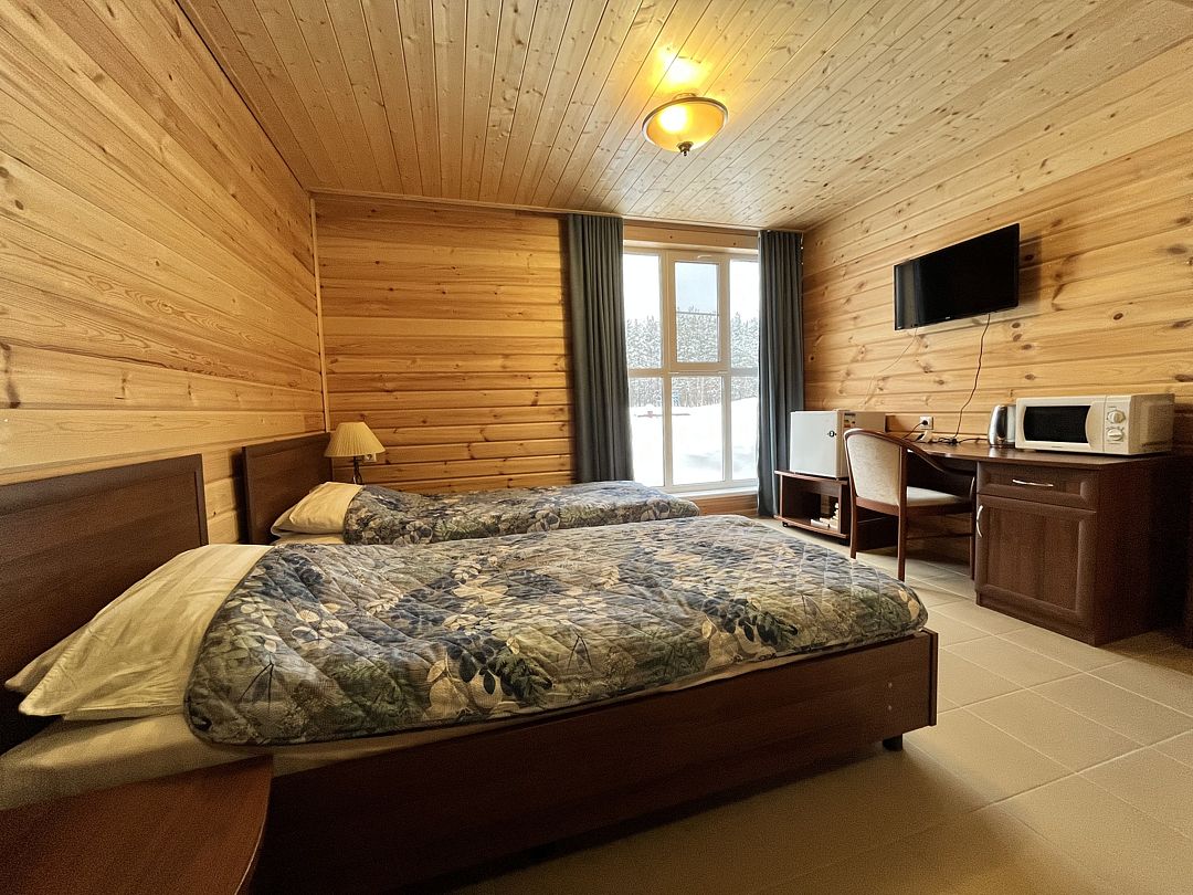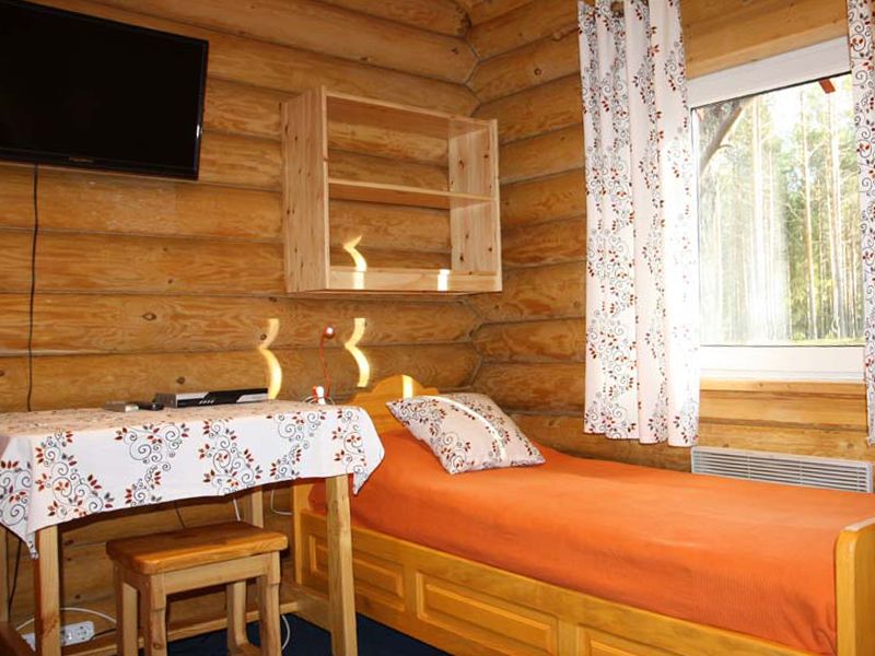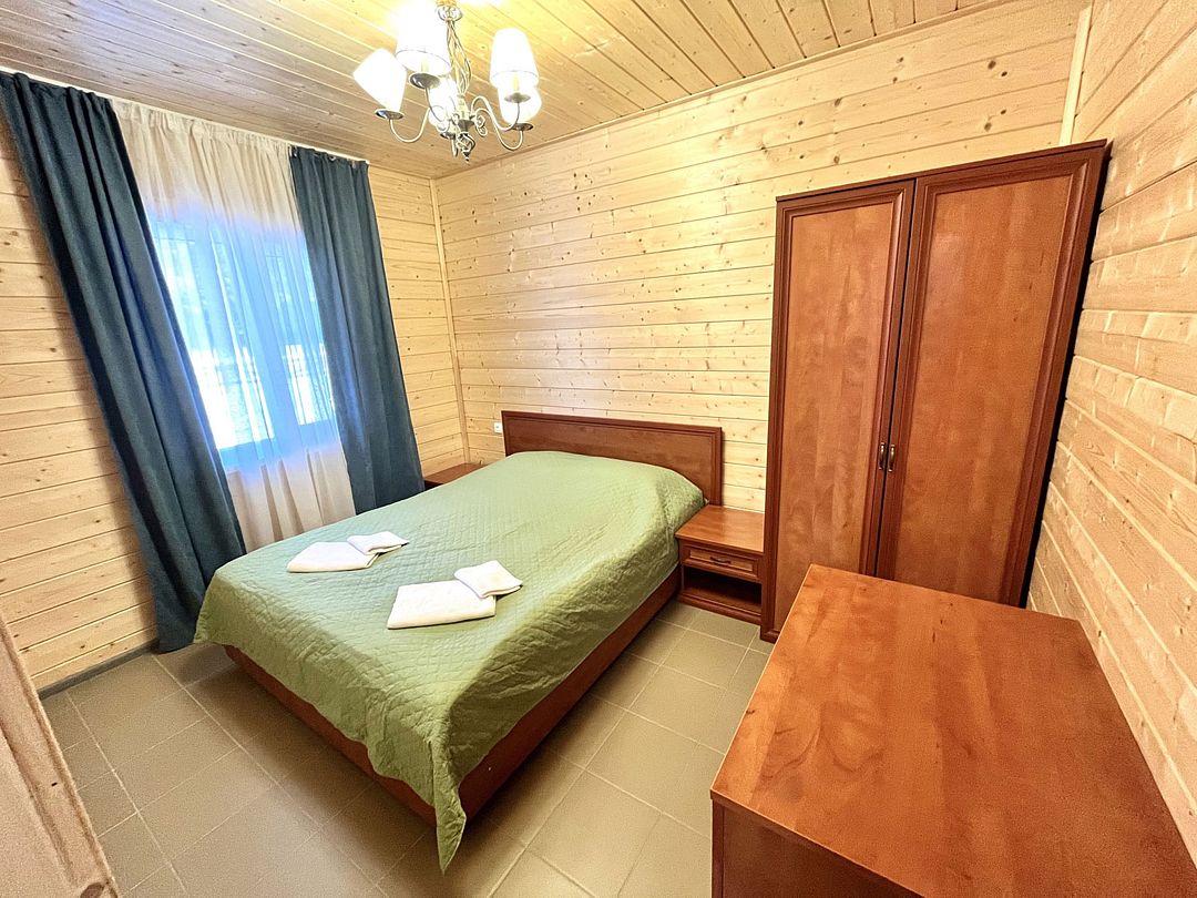 Двухместный коттедж, расположенный в сосновом парке недалеко от горки. Состоит из одной комнаты и туалета с душевой кабиной. В коттедже предусмотрены две полутороспальные кровати, комод, два шкафа, а также микроволновая печь, чайник и холодильник.