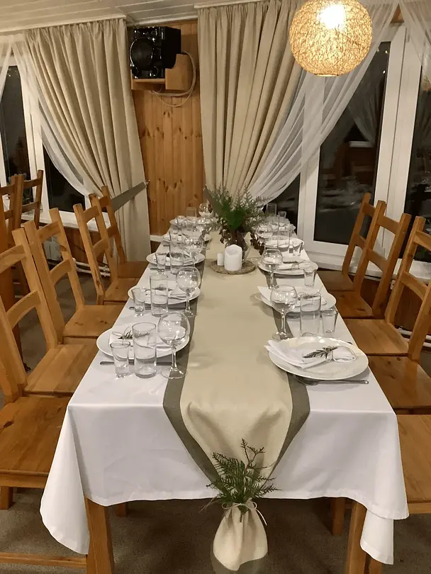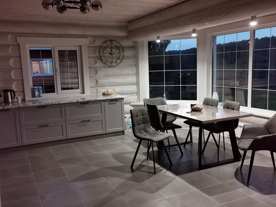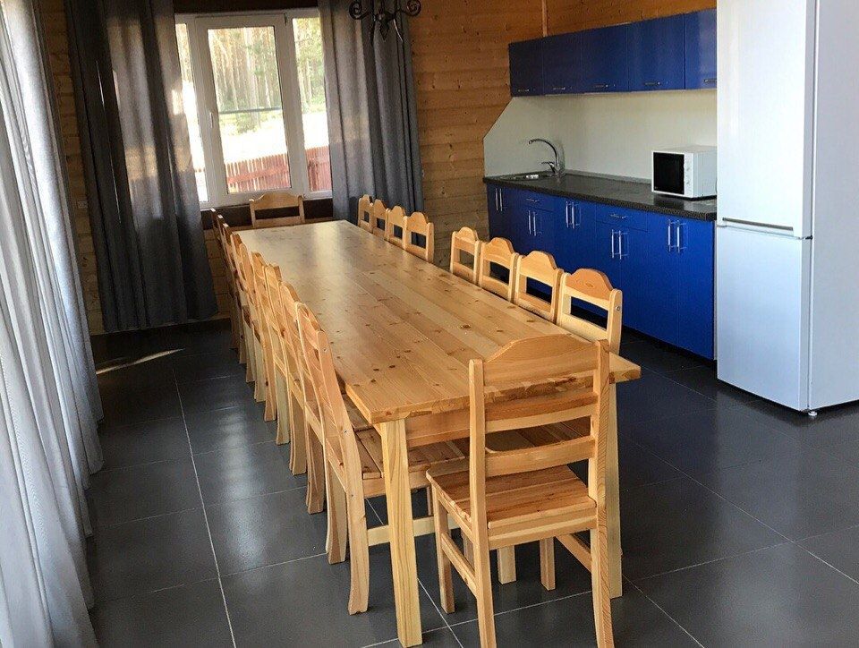 В доме четыре санузла с душевыми. На первом этаже есть сауна. Большой холл с кухней на двадцать человек. Панорамные окна выходят прямо на лыжный стадион. Коттедж идеален для больших компаний, спортивных команд, а также для празднования свадеб и юбилеев.