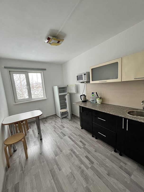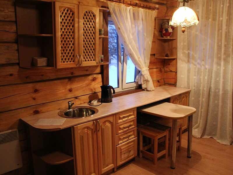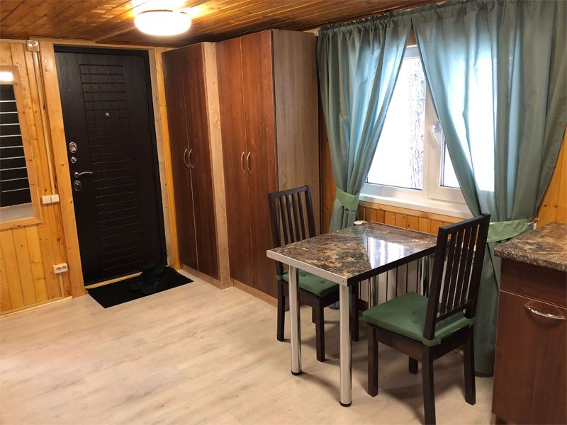 Мини-кухня оборудована столиком и стульями, что обеспечивает комфортные условия для отдыха.
