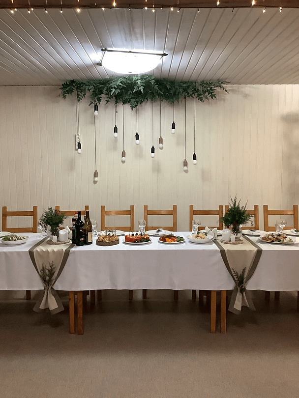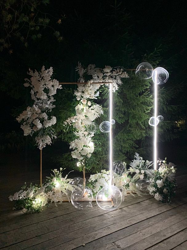 Гастрономический опыт будет не менее впечатляющим — повара устроят изысканный банкет, запоминающийся своим вкусом и эстетикой, и предложат детское меню для маленьких гостей. Перед основным торжеством гости насладятся фуршетом на свежем воздухе, а молодоженов ждет счастливый финал — романтическая ночь в украшенном коттедже в подарок от комплекса.