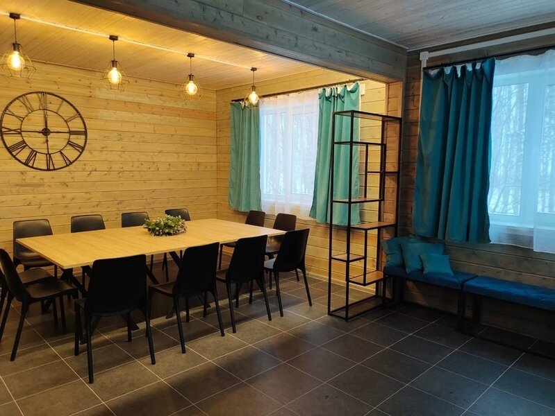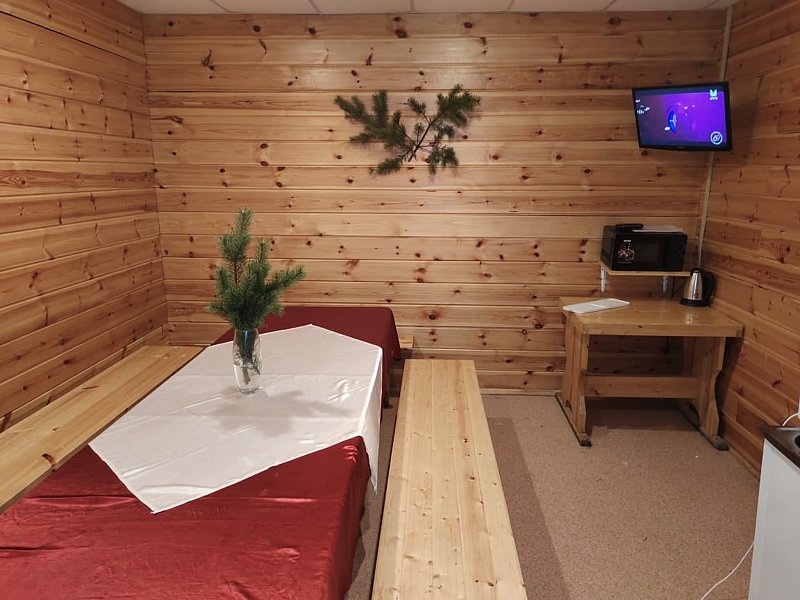 Без спальных мест. Вместимость до 50 человек. Большой стол, скамейки, СВЧ-печь, чайник. Помещение отапливается.