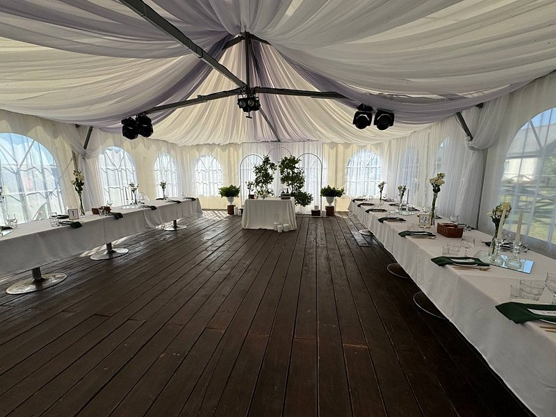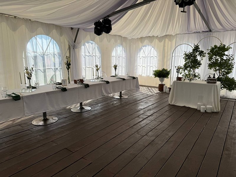 Стильный белоснежный шатёр вместимостью до 90 человек находится на высоком берегу реки, на большой территории в парковой зоне.