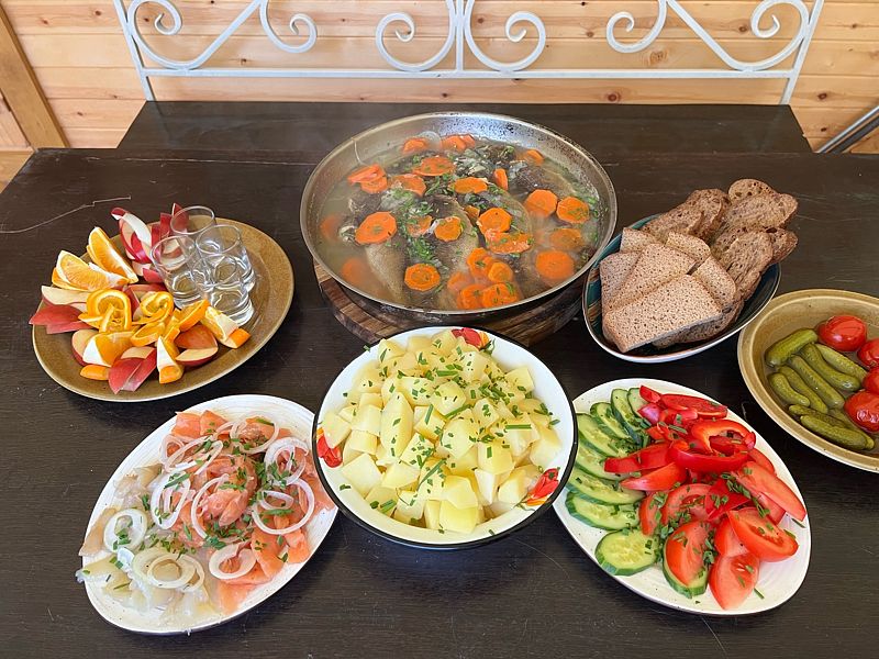 Работают профессиональные повара, которые приготовят как обычные блюда, так и познакомят вас с поморской кухней. Вы можете заказать свое меню на каждый день. Также повара могут приготовить вкусный ужин из вашего улова.
