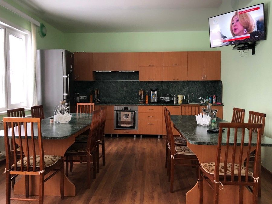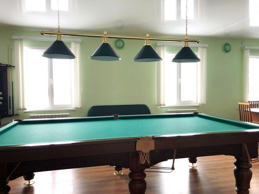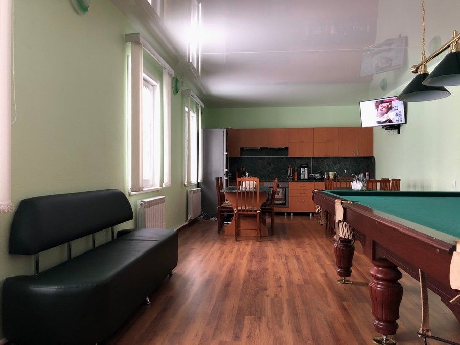 Кухня оборудована электротехникой (большой холодильник, электроплита с духовкой, микроволновая печь, посудомоечная машина) для самостоятельного приготовления пищи с залом на 15 посадочных мест, холл с бильярдом и большим телевизором.