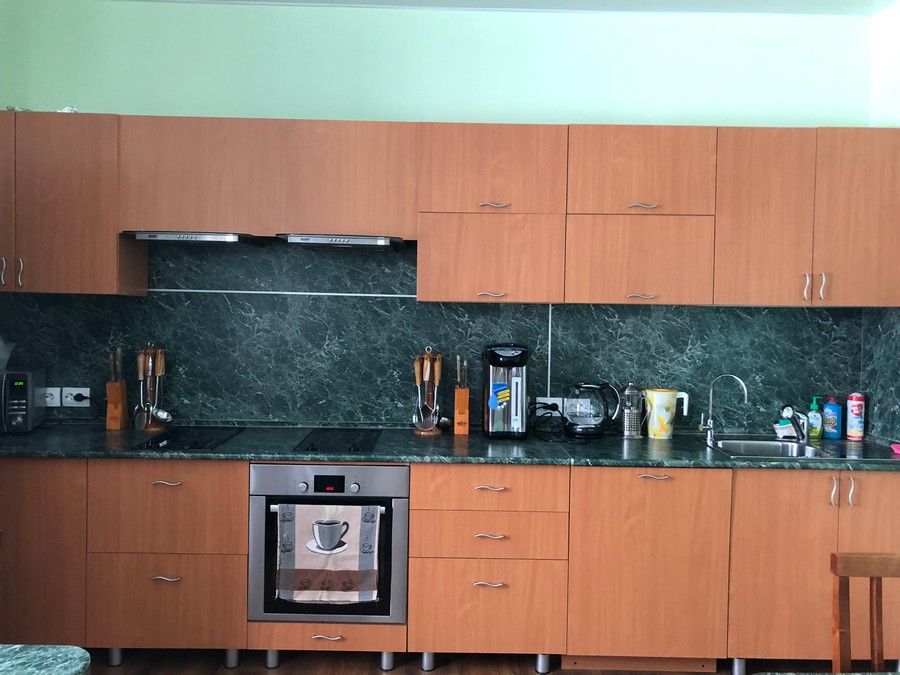 Кухня оборудована не только холодильником, электроплитой, сковородками-кастрюлями, тарелками, чашками-стаканами-бокалами-рюмашками, ложками-ножками-вилками и т.д., но и посудомоечной машиной. Есть какие-то минимальные крупы, соль, сахар. И штопор! Гладильная доска, опять же, с утюгом у окна.
