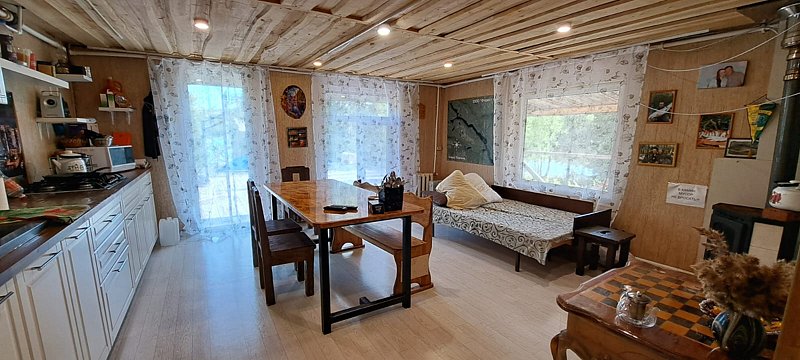 Кухня-столовая 6×20 метров с видом на озеро (10 м до берега), большой стол для дружеских посиделок, спутниковое ТВ (Триколор) 300 каналов, камин, кухонный гарнитур (вся необходимая посуда в достаточном количестве, 5 конфорок газовая плита с электроподжигом, духовой шкаф, микроволновая печь, электромясорубка).