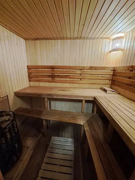 Парилка, моечная, комната отдыха: диван, стол, стулья, плазменный ТВ, термопот, холодильник для охлаждения напитков.