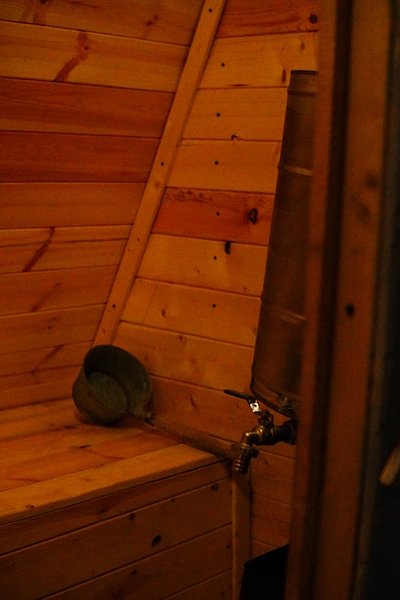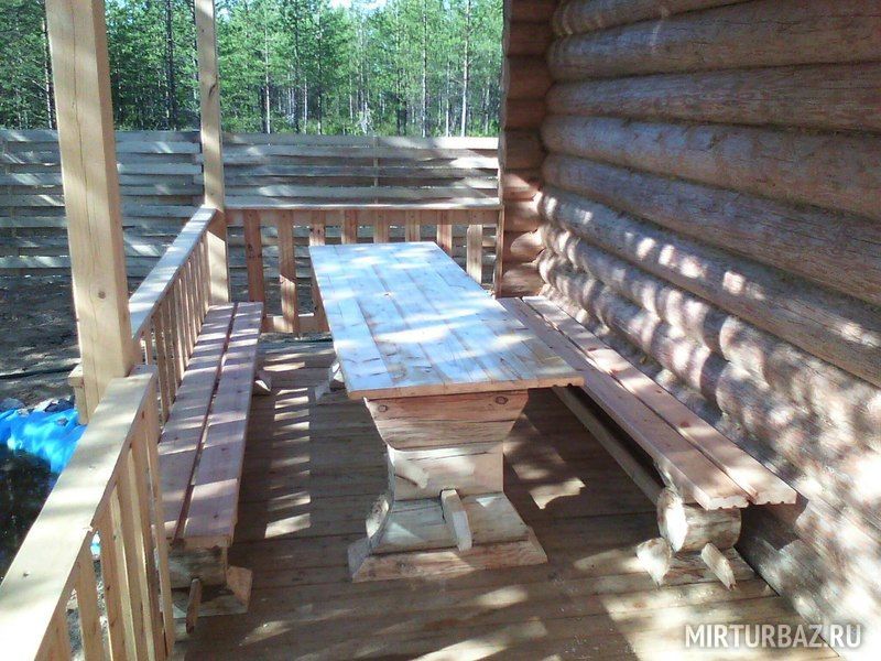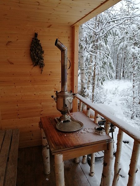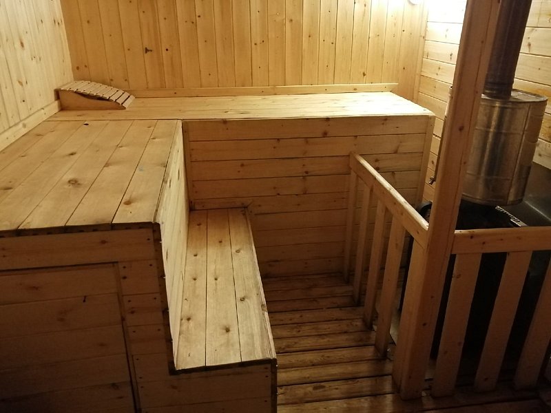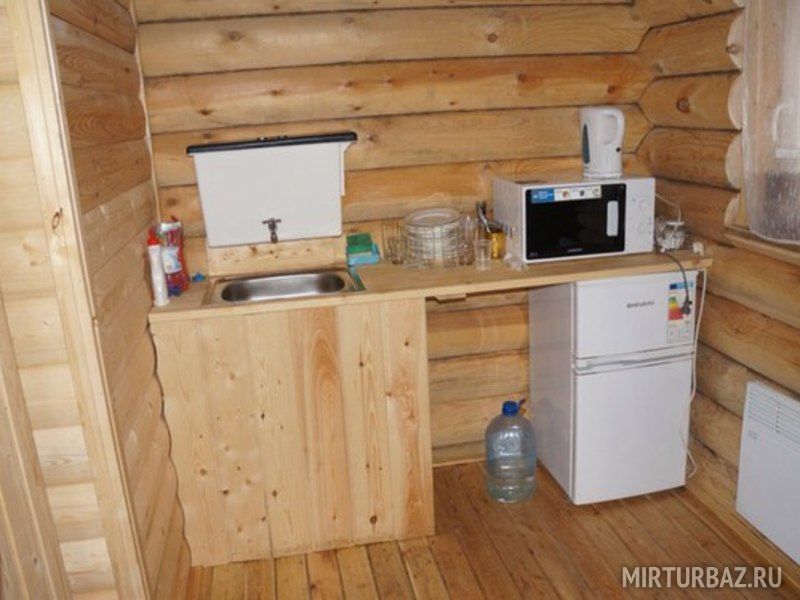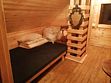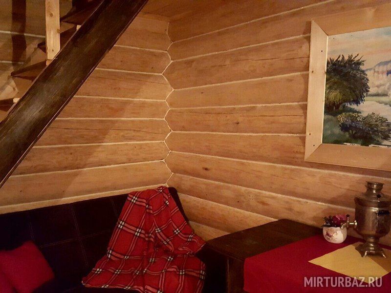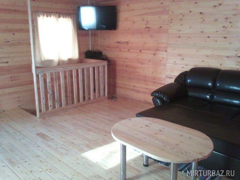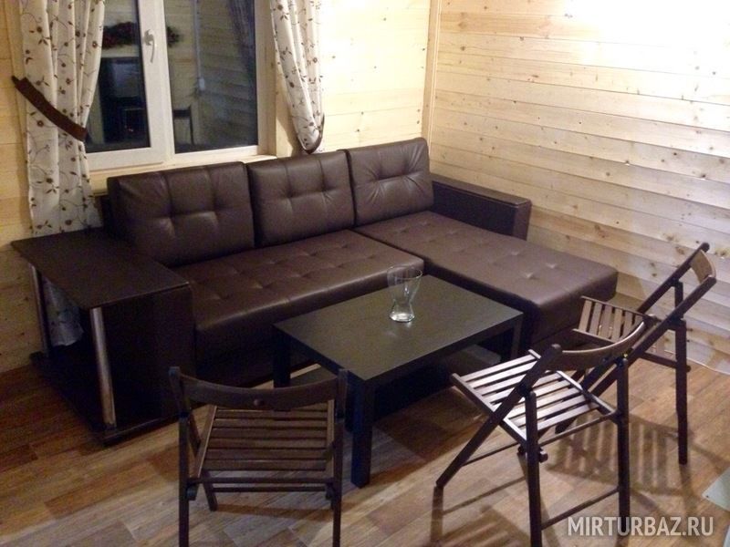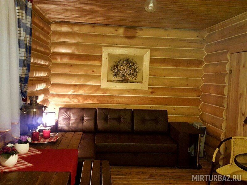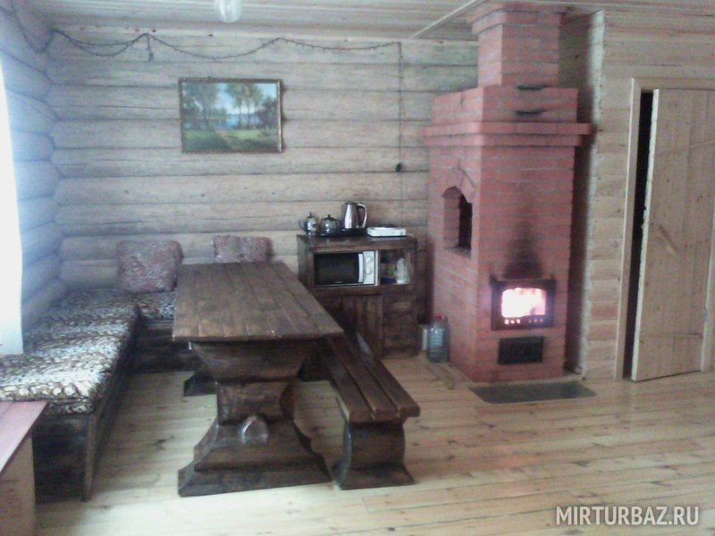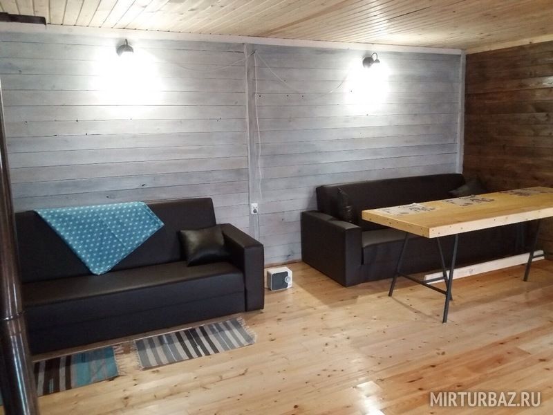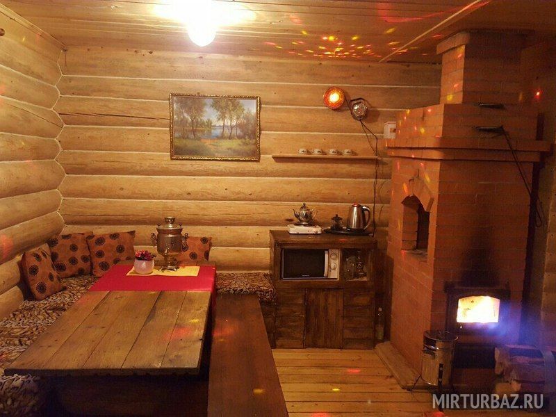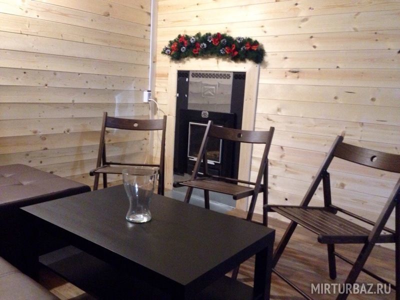 Дом с банькой внутри, с тремя отдельными комнатами, на 10 спальных мест. В доме есть диваны, столы, стулья, камин.