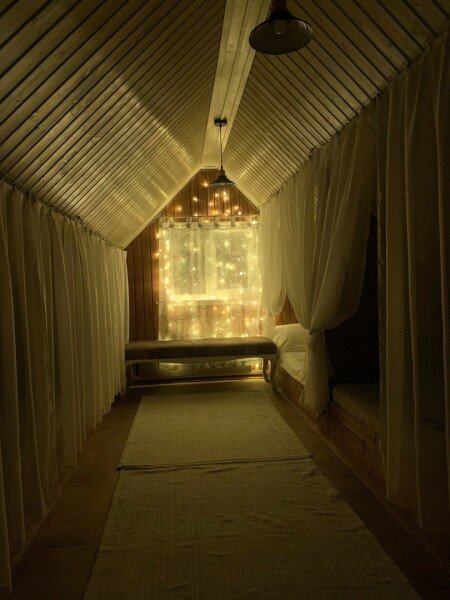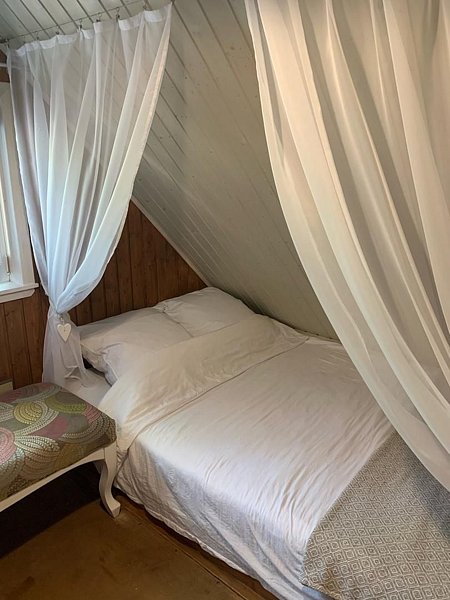 Второй этаж: спальня на шесть разделенных между собой спальных мест (две двуспальные, две односпальные кровати) и лаунж-зона. Предоставляется чистое постельное белье по количеству человек. Комфортное размещение в нашем уютном домике, от двух до четырех взрослых, остальное дети (не более шести человек).