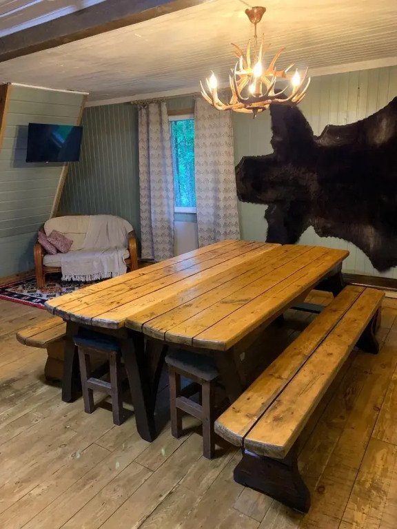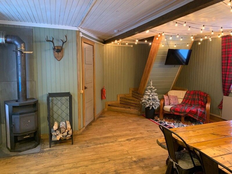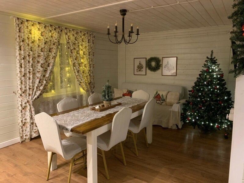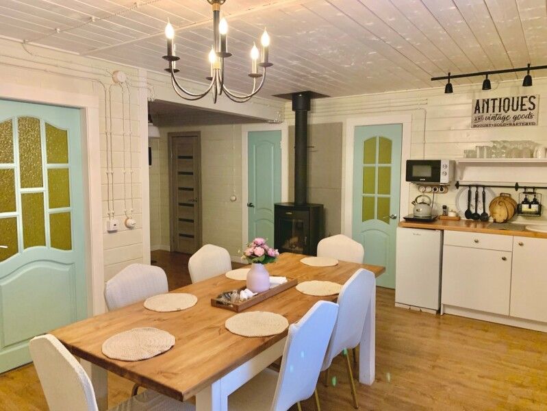 Первый этаж: гостиная с дровяным камином, кухня со всей необходимой техникой, посудой и питьевой водой, санузел (душа нет, есть баня), в столовой зоне вместительный стол до двенадцати мест, телевизор, музыкальный центр.