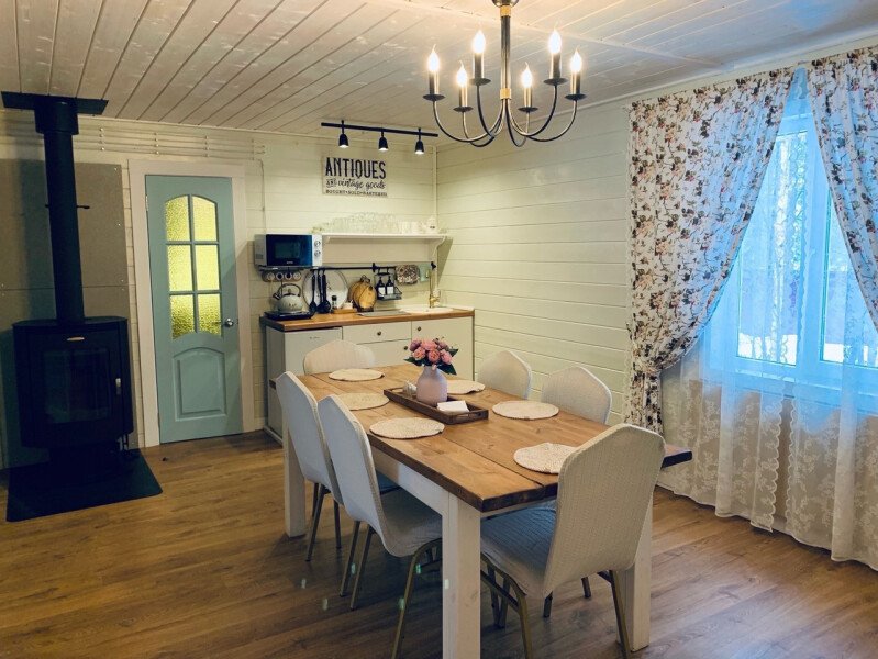 Дом подходит для празднования небольших камерных свадеб, корпоративов, встречи друзей, семейных вечеров и другого типа мероприятий до двадцати человек. Вмещает двадцать гостей за столом, четырнадцать спальных мест в отдельных комнатах.