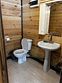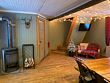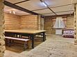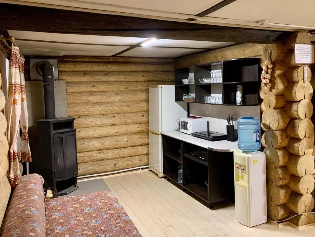 В зале кухонная зона: термопот, микроволновка, холодильник, отопление: температура зимой +19–21°С, санузел (теплая вода), диван, столы, стулья. На территории: мангальная зона.