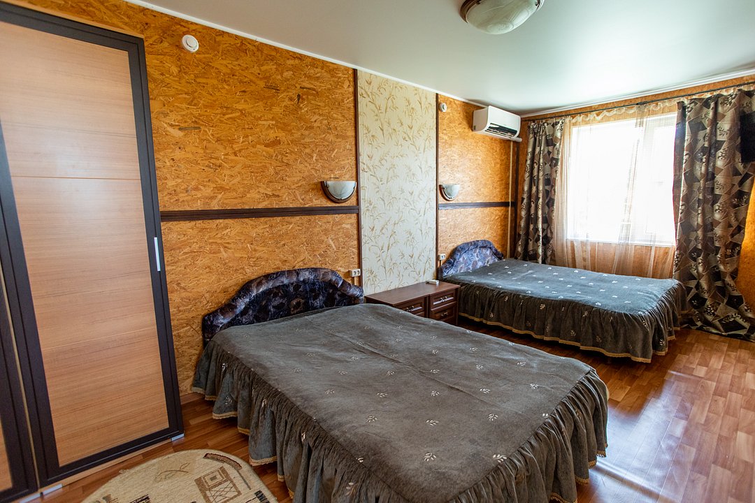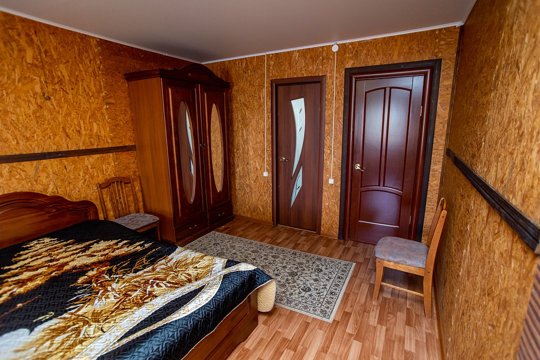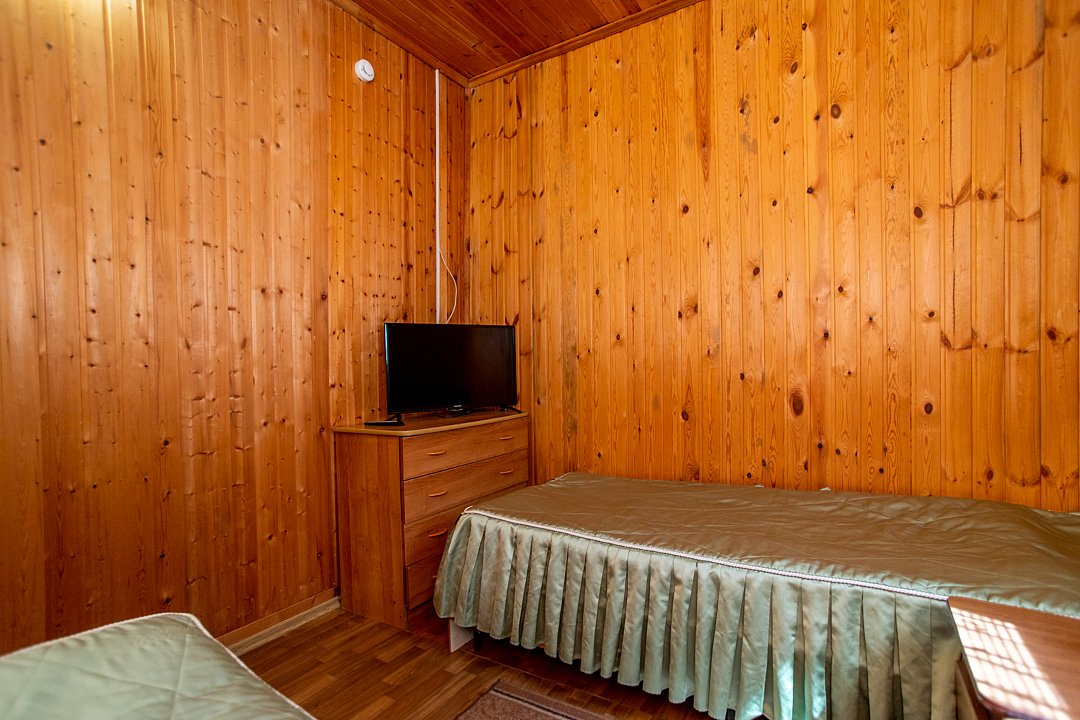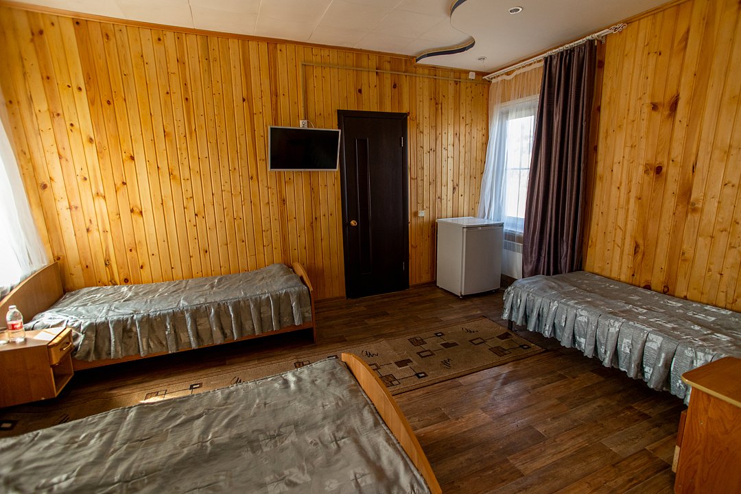 В номере три двуспальных кровати, диван, индивидуальный санузел, сплит-система/кондиционер, пианино. Номер оснащен холодильником, телевизором. Идеально для рыболовно-охотничьего тура. В стоимость входит проживание, трехразовое питание, водный трансфер, услуги егеря с моторной лодкой (при размещении в лодке 2-3 человека).