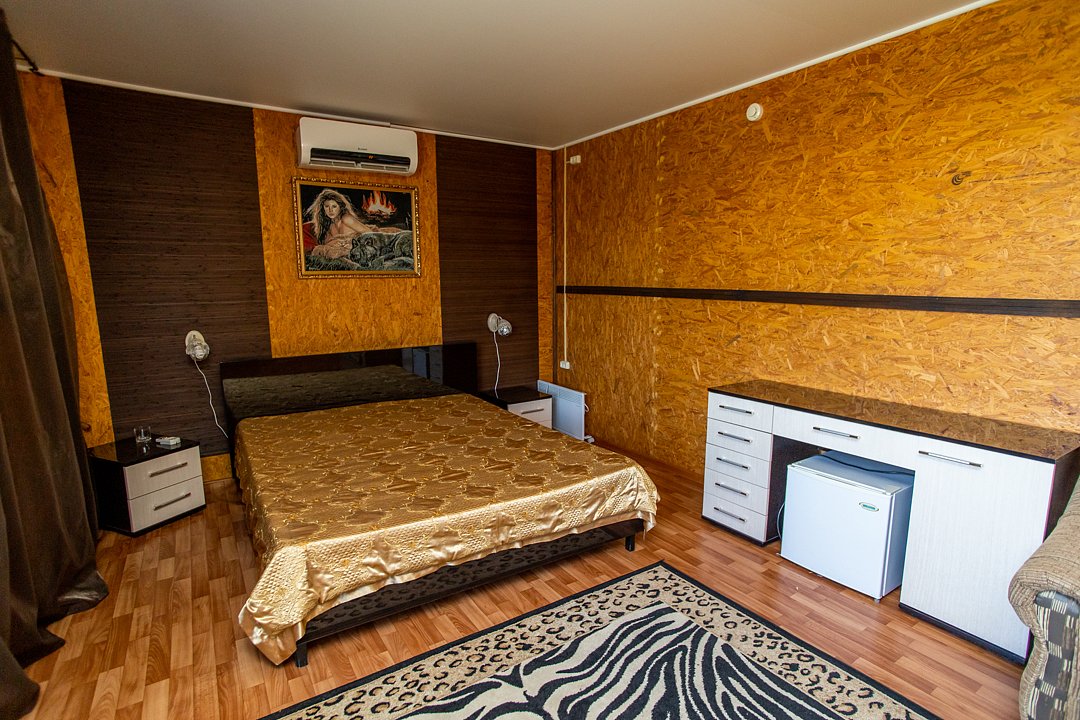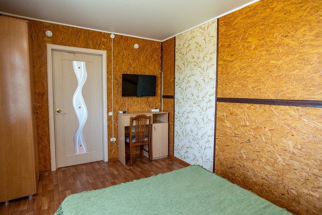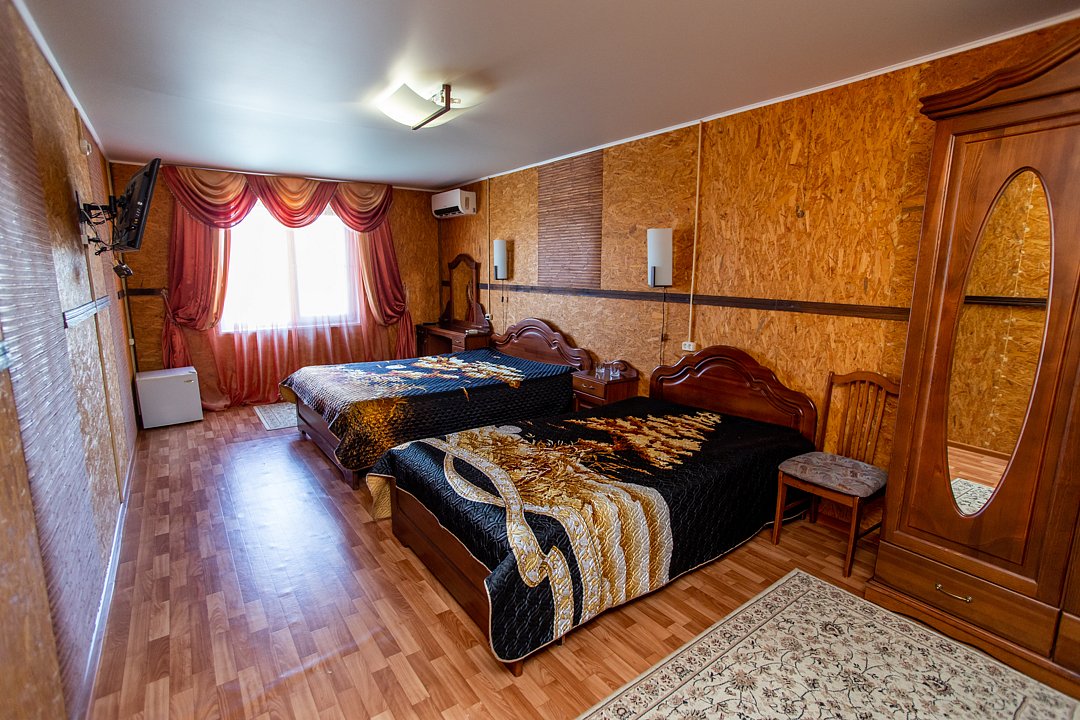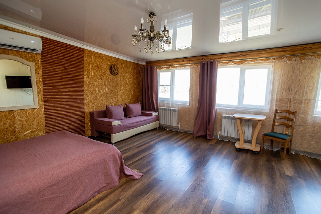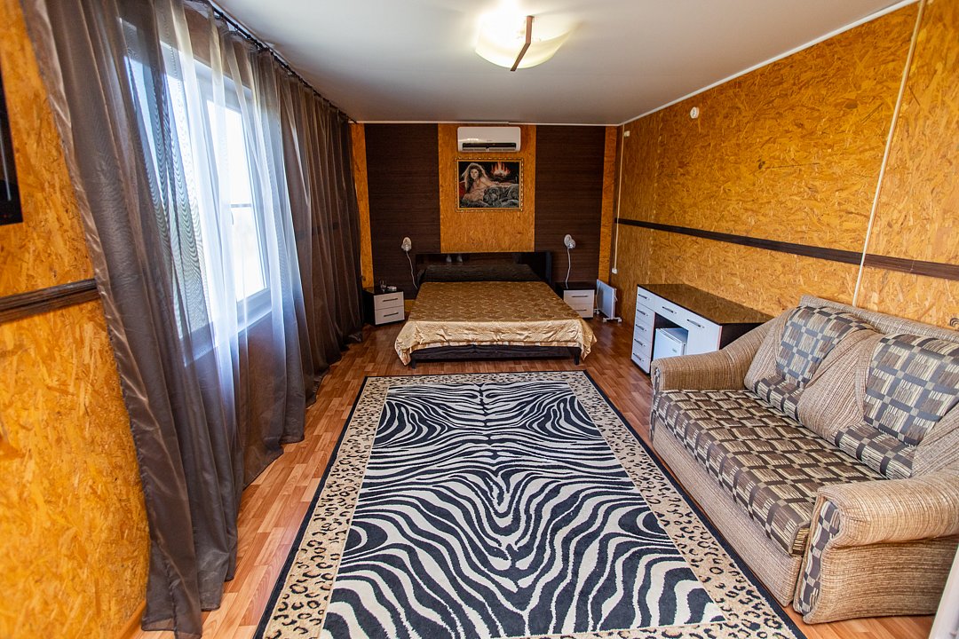 В номере три двуспальных кровати, диван, индивидуальный санузел, сплит-система/кондиционер, пианино. Номер оснащен холодильником, телевизором. Идеально для рыболовно-охотничьего тура. В стоимость входит проживание, трехразовое питание, водный трансфер, услуги егеря с моторной лодкой (при размещении в лодке 2-3 человека).